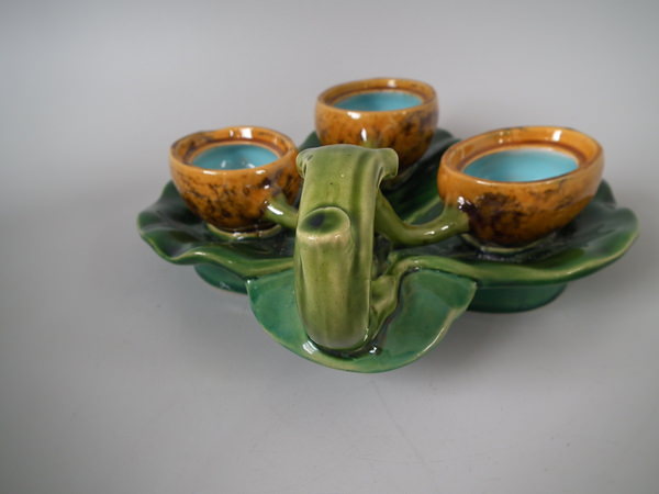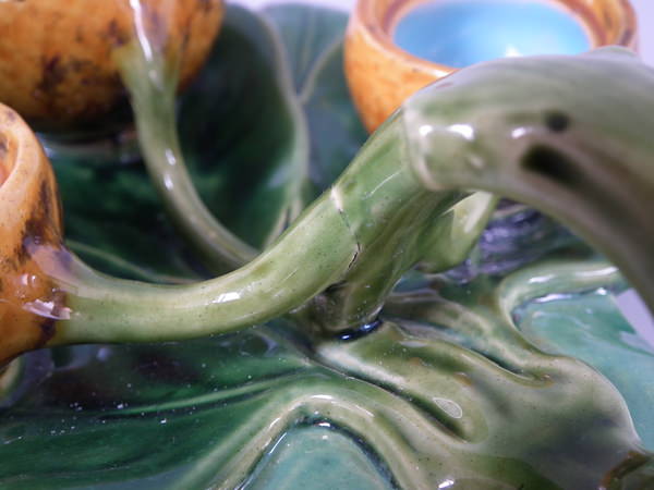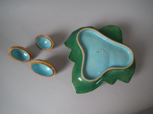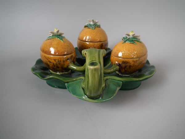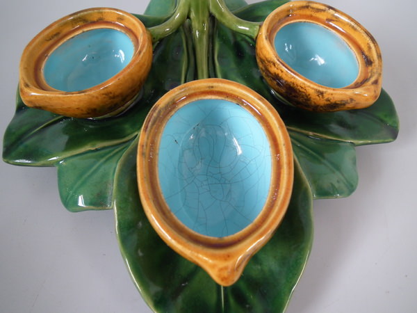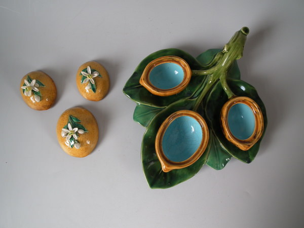 Minton Majolica serving dish which features three lidded lemon pots, sat on leaves.