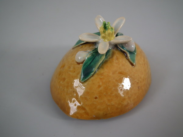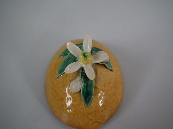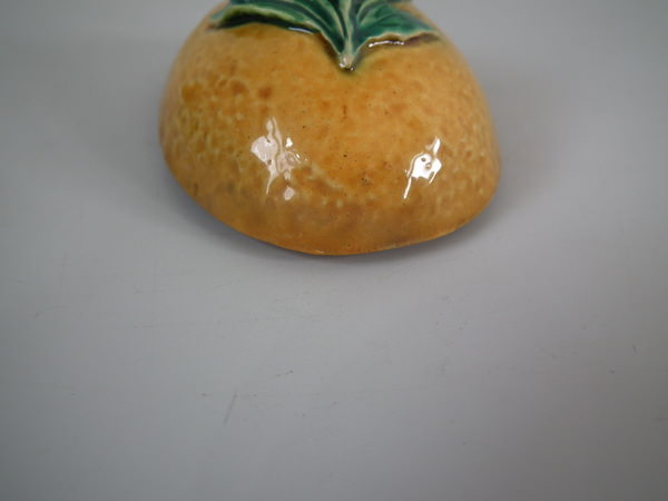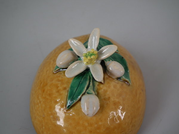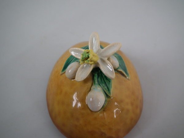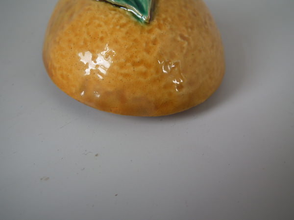 RESTORATION: Stabilized and retouched crack to one side of lemon.