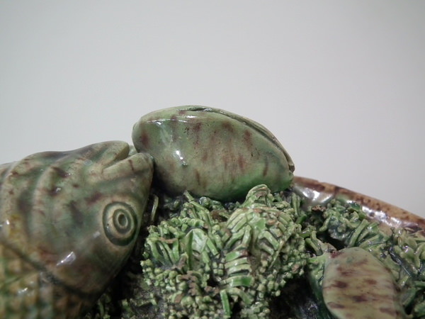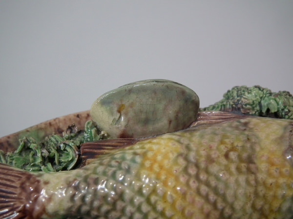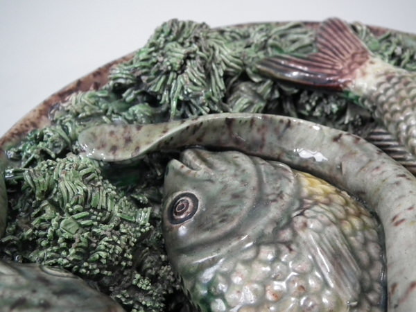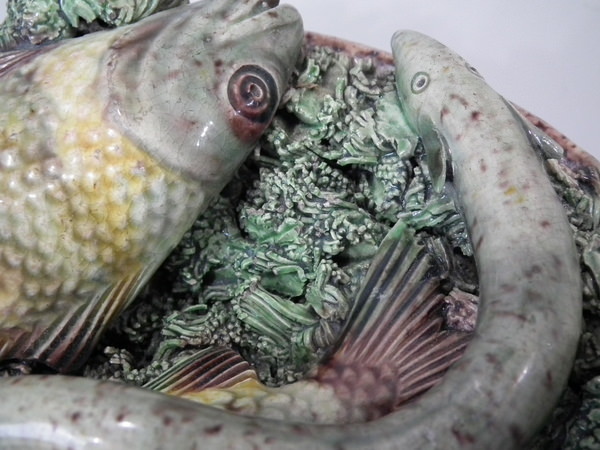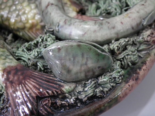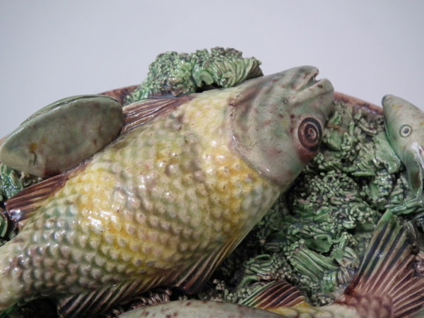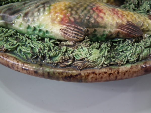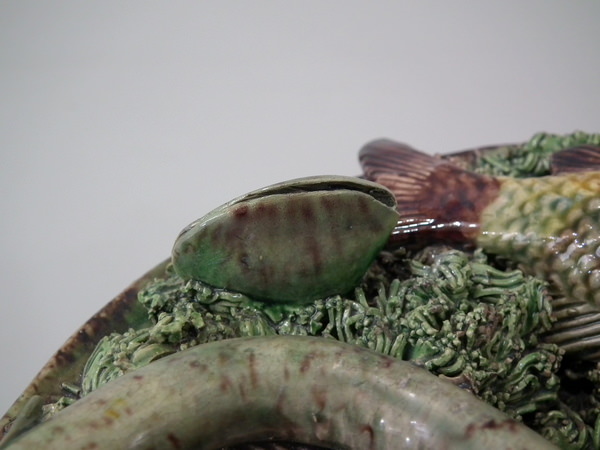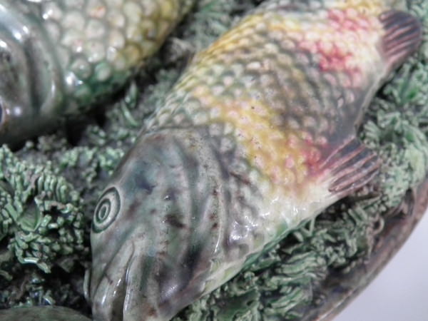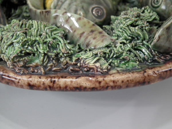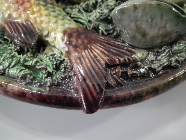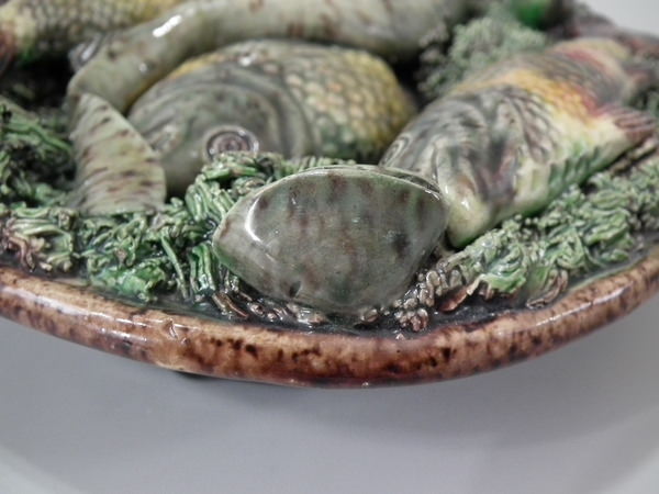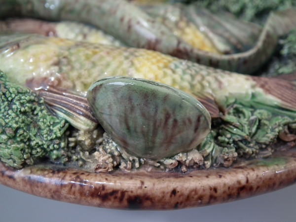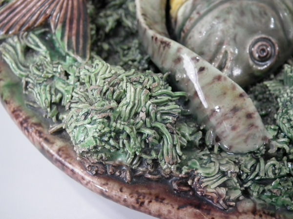 Victorian, circa 1890. 7ins high, 7ins wide, 0.2ins depth. Mafra Portuguese Palissy Majolica wall plate which features three fish, an eel and mussels on shredded clay.