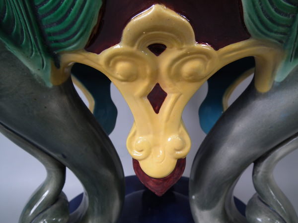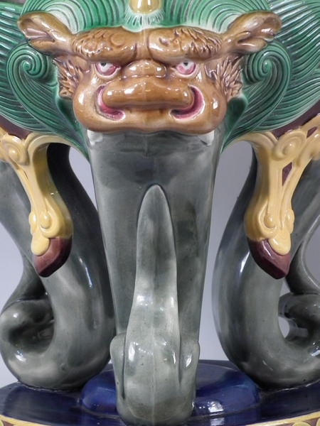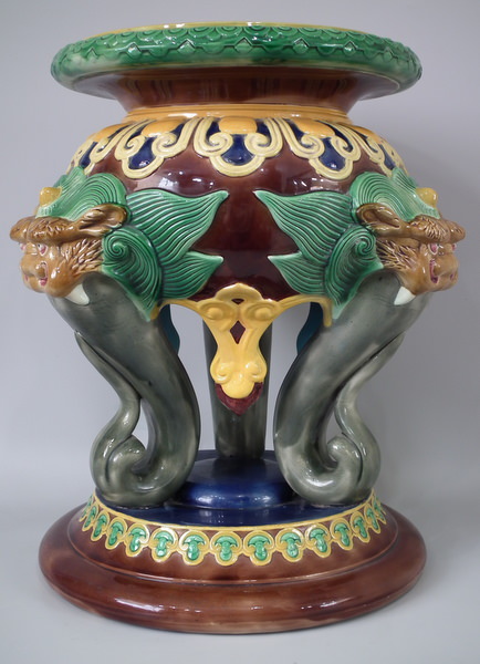 Brown Westhead Moore & Co Majolica garden seat which features 3 gargoyles, their tongues forming the legs.
