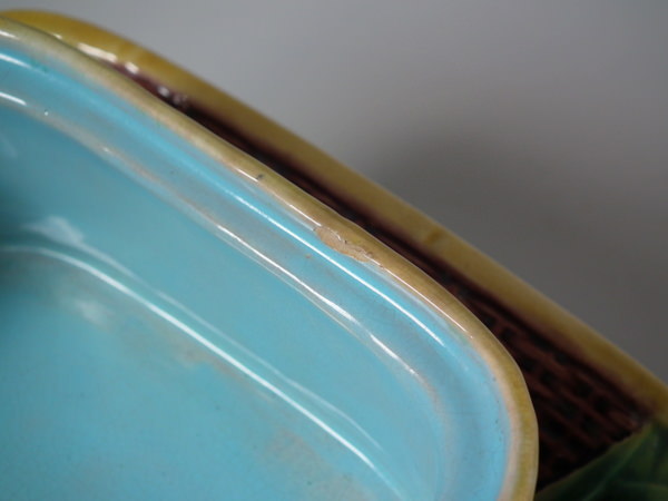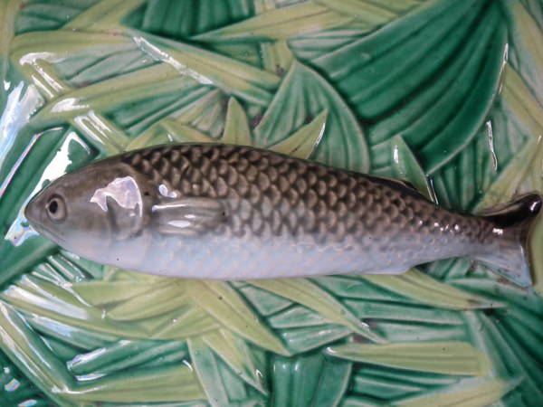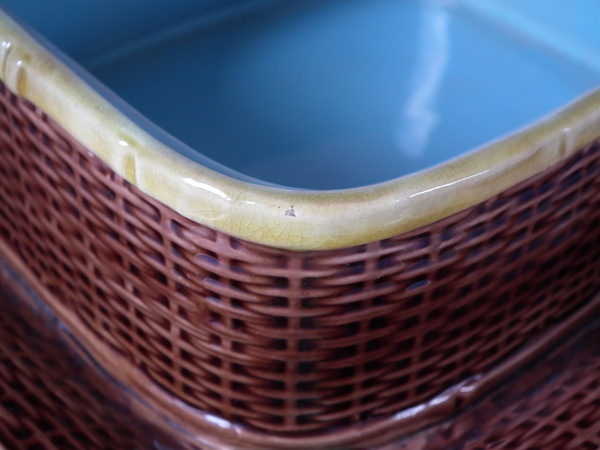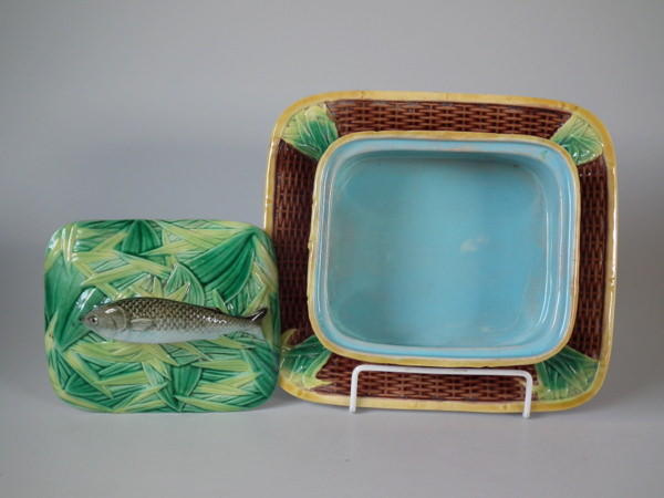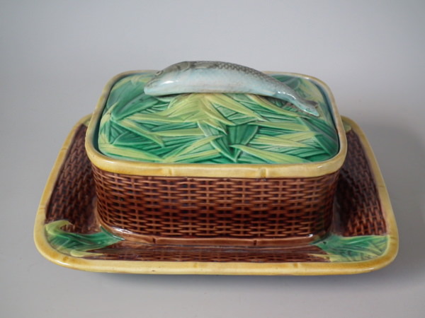 George Jones Majolica sardine box which features a sardine laying on a bed of reeds forming the lid and a wicker basket forming the dish.