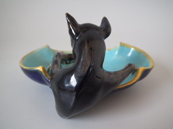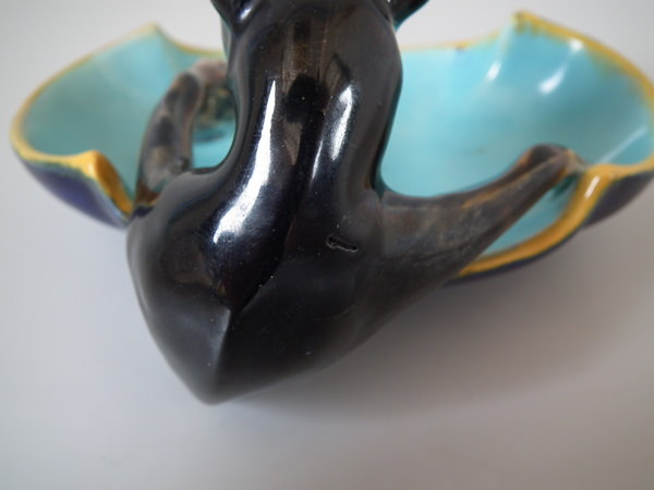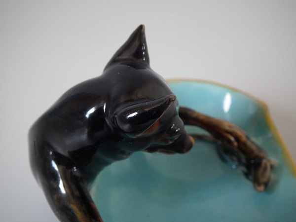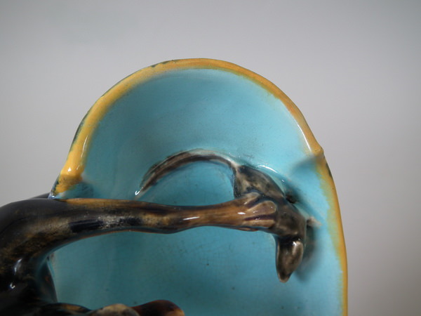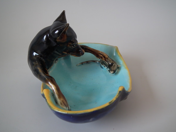 Victorian, circa 1870. 3.1ins high, 4.7ins wide, 3.5ins depth. George Jones Majolica figural which features a dog catching a mouse. Colouration: turquoise, brown, ochre, are predominant.
