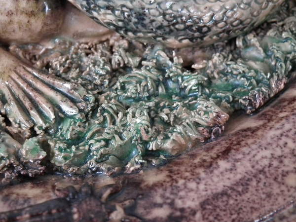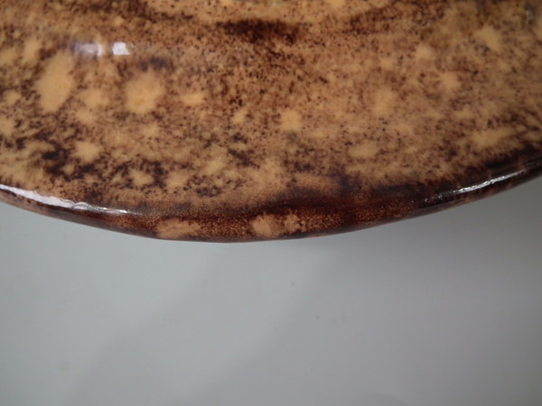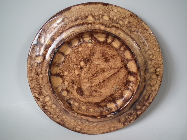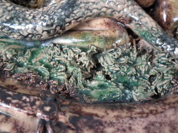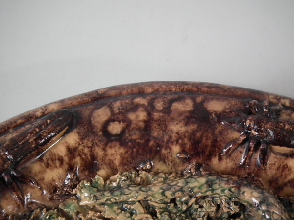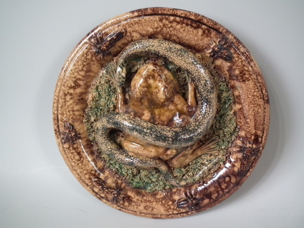 Mafra Portuguese Palissy Majolica wall plate which features a toad with a snake over its back. Brown ground version. Colouration: brown, green, black, are predominant.