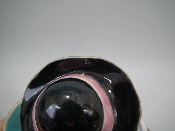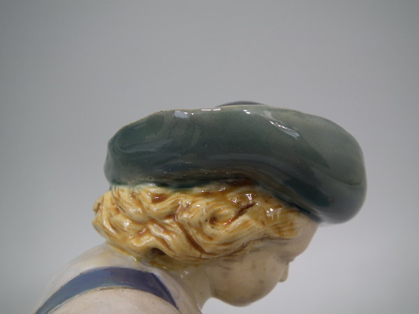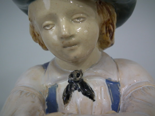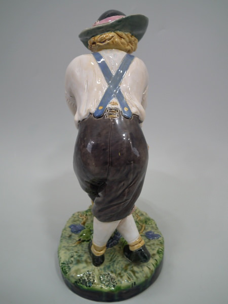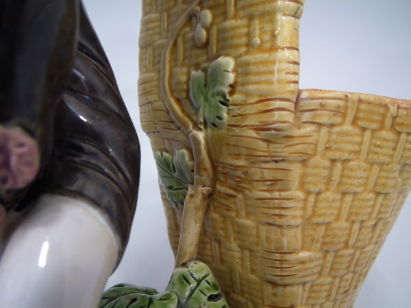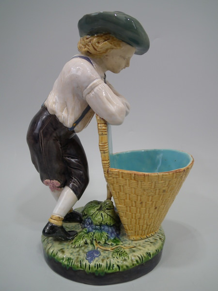 Victorian, circa 1868. 9.6ins high, 6.3ins wide, 4.4ins depth. Minton Majolica flower holder which features a male vintager leaning over a basket. Colouration: ochre, turquoise, green, are predominant.