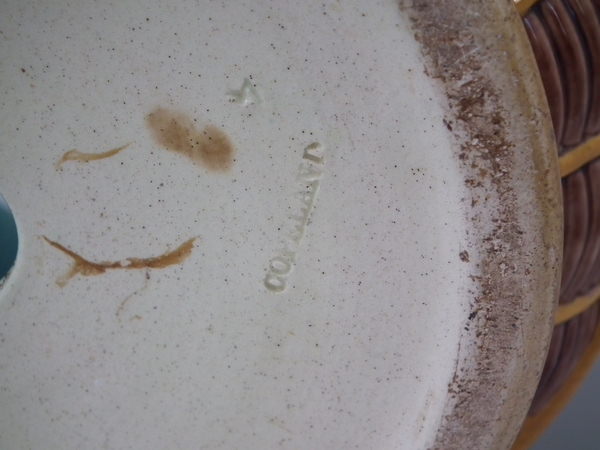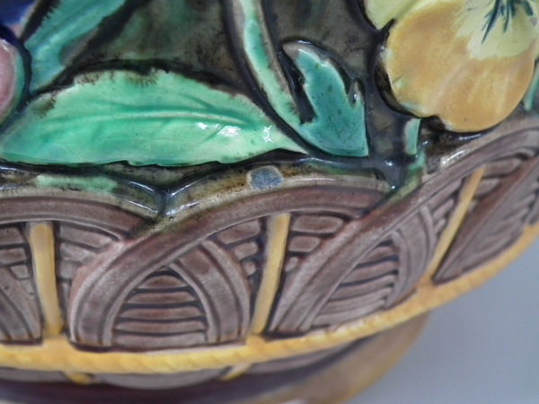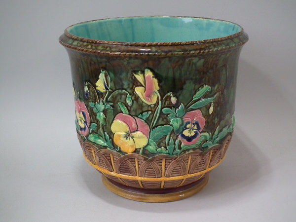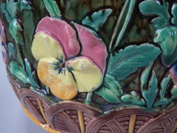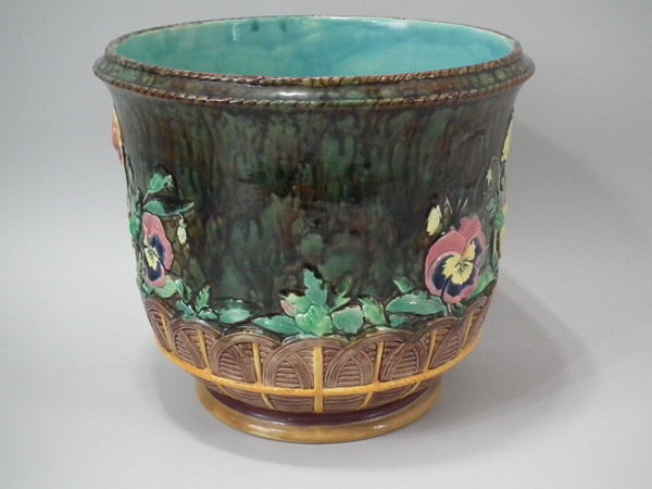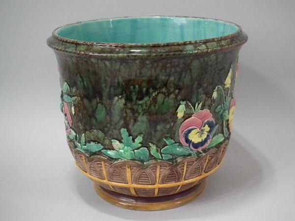 Copeland Majolica jardinière which features pansy's growing from a woven basket border. Colouration: brown, green, yellow, are predominant.