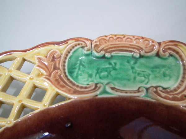 Pierced rim divided by three cartouches of grazing deer and a hunting scene.
