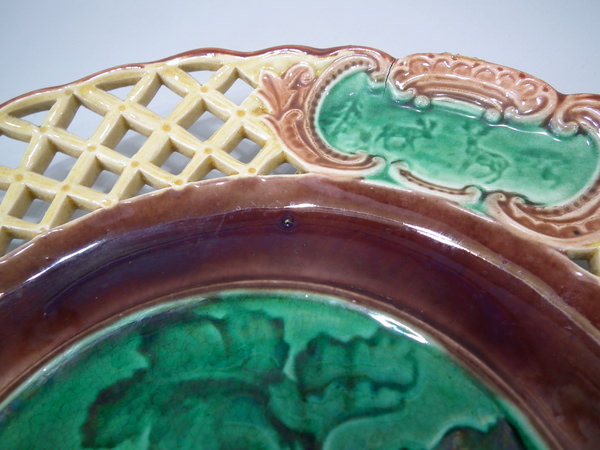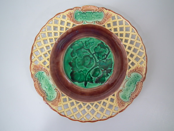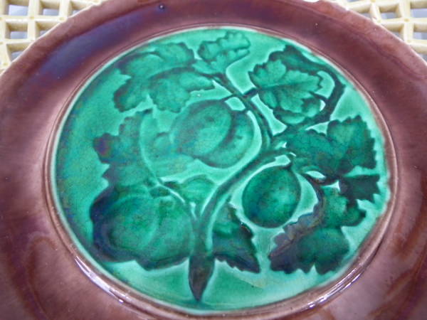 Victorian, circa 1880. 9.1ins high, 9.1ins wide, 1ins depth. Wedgwood Majolica plate which features a bunch of plums in green glaze to the centre.