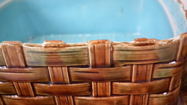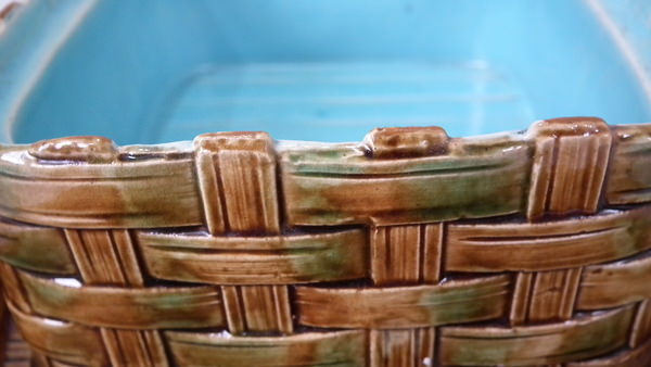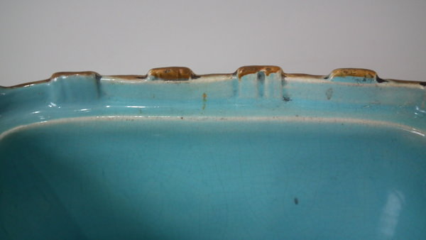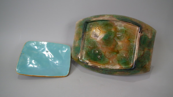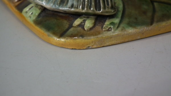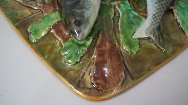 George Jones Majolica sardine box which features three fish lying on a bed of seaweed. Colouration: brown, green, turquoise, are predominant.