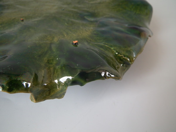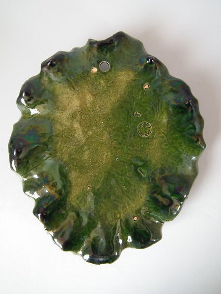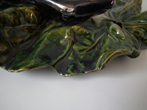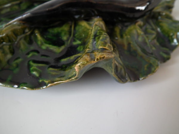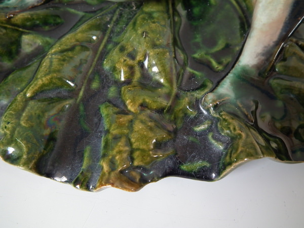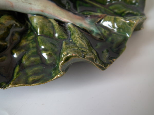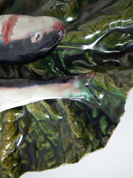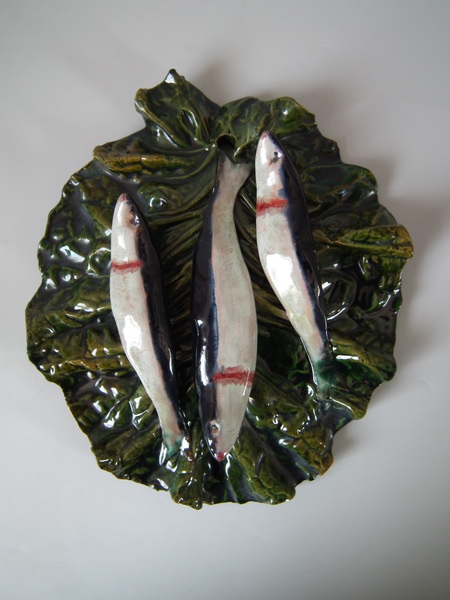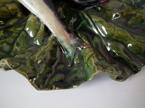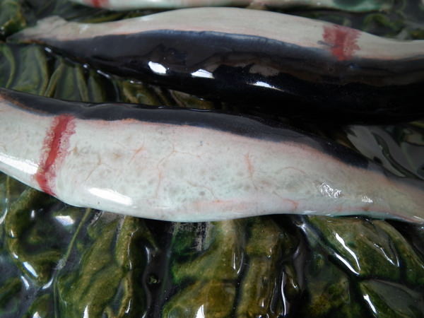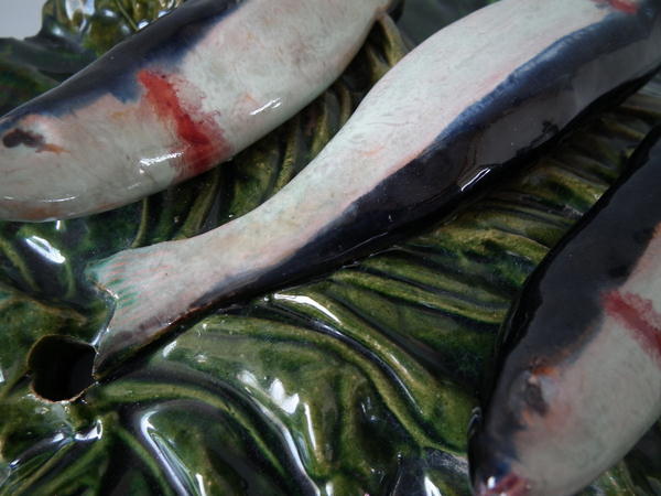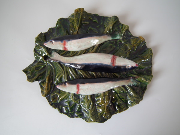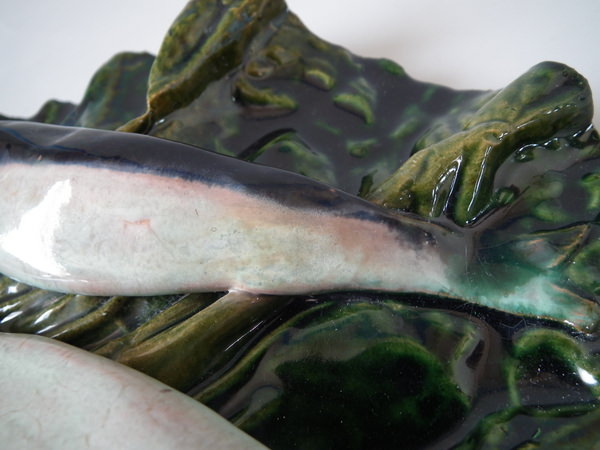 Victorian, circa 1890. 10.6ins high, 9.1ins wide, 2ins depth. Cunha Portuguese Palissy Majolica wall plate which features three fish.