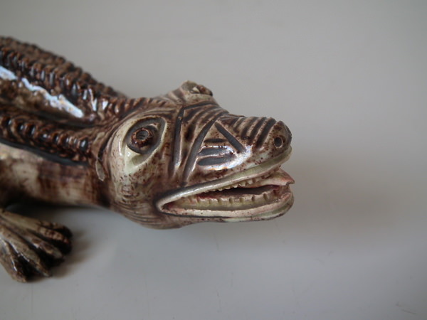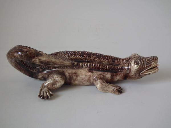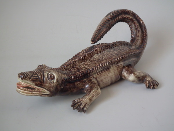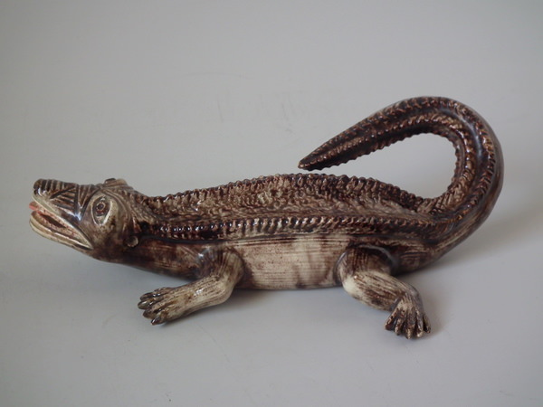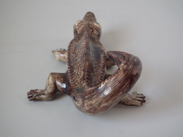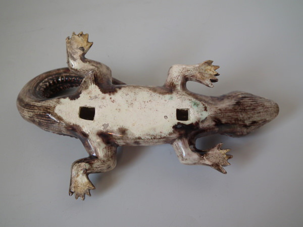 Victorian, circa 1890. 6.7ins high, 3.9ins wide, 2ins depth. Portuguese Palissy Majolica figural which features a lizard.