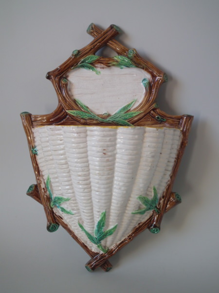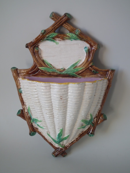 Victorian, circa 1870. 10.8ins high, 7.5ins wide, 3ins depth. George Jones Majolica wall pocket which features a basket with branch surround.