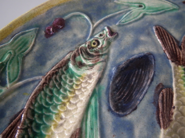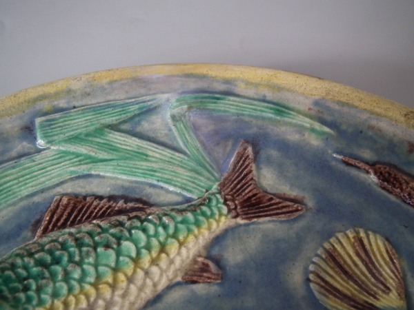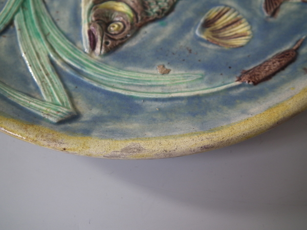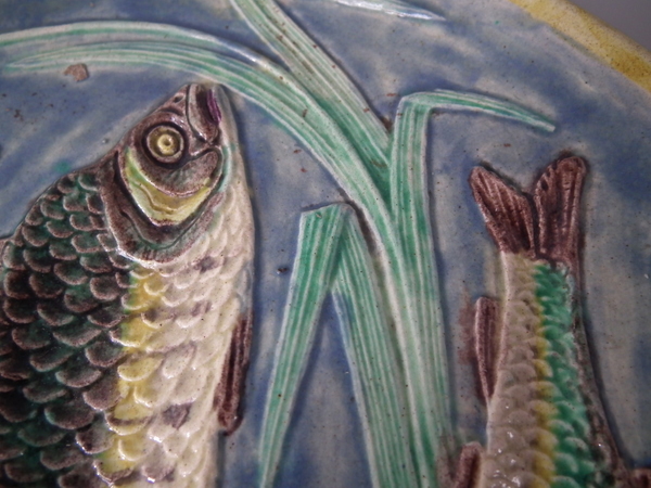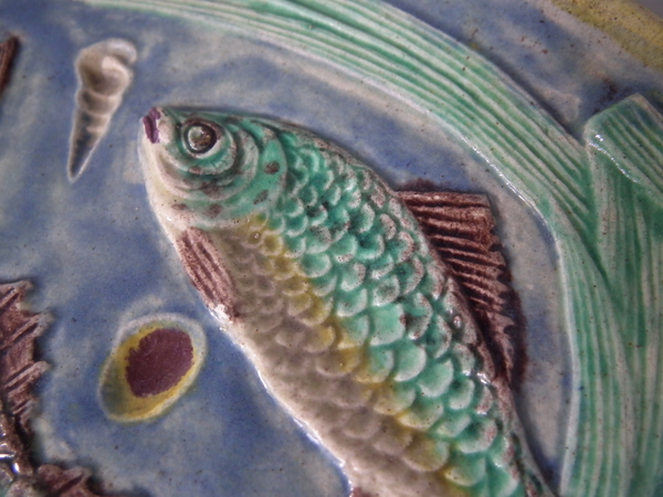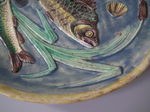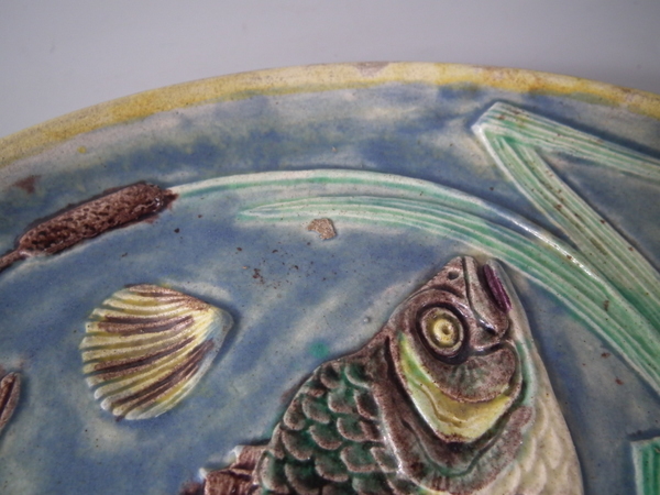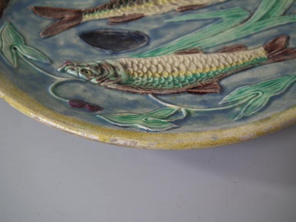 Victorian, circa 1890. 9.1ins high, 9.1ins wide, 0.9ins depth. Palissy Majolica plate which features three fish swimming amongst bulrushes and shells.