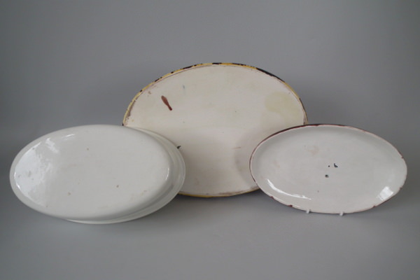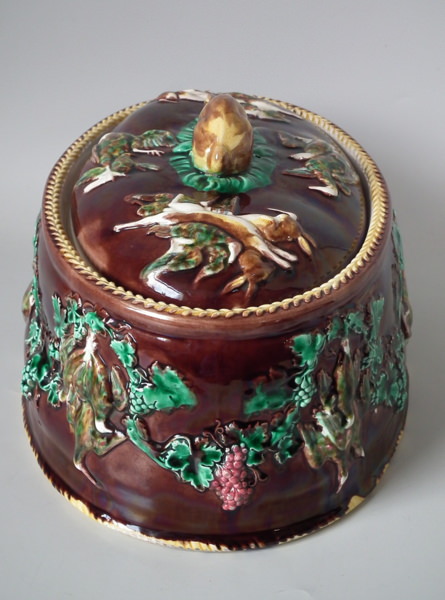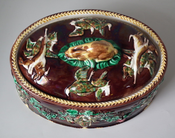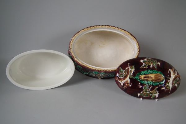 Victorian, circa 1878. 6.9ins high, 12.6ins wide, 9.3ins depth. Wedgwood Majolica game pie dish which features a crouching rabbit handle, trailing grape vine and hanging game around the sides.