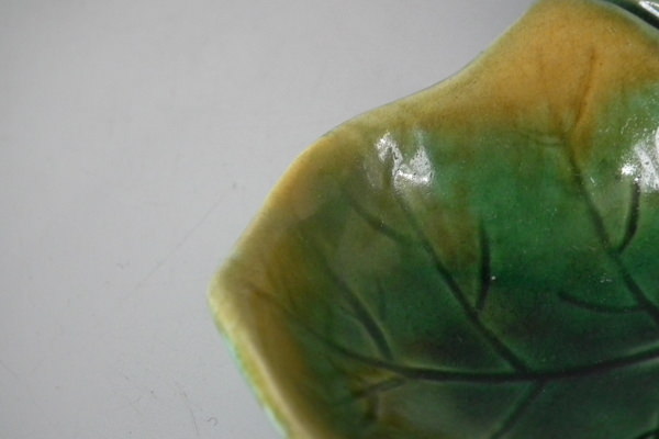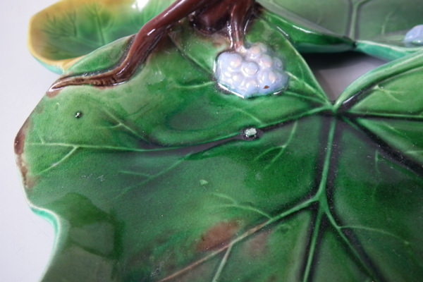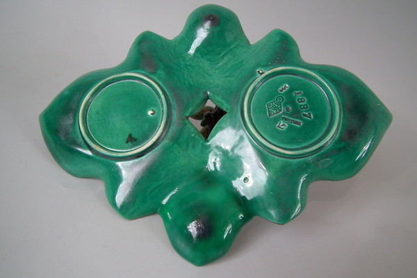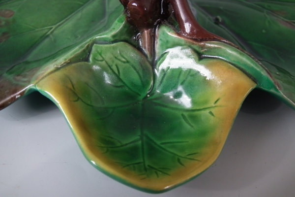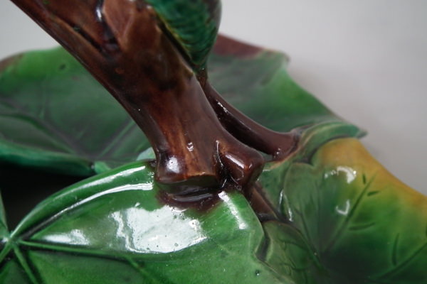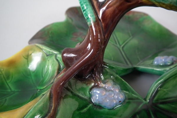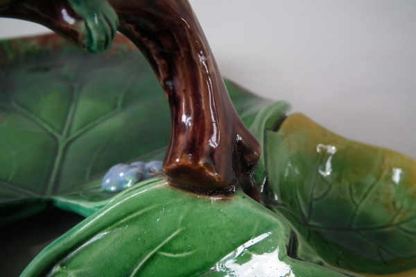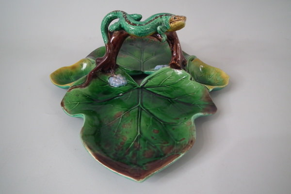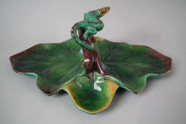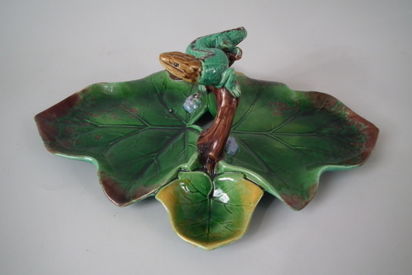 Victorian, circa 1874. 4.1ins high, 11.2ins wide, 8.7ins depth. Minton Majolica serving dish which features a lizard climbing up a branch. Colouration: brown, green, ochre, are predominant.