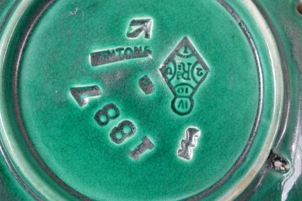 The piece bears maker's marks for the Minton pottery. English diamond registration mark for the date 10/07/1874. Marks include a factory specific date cipher for the year 1874.