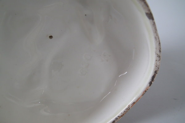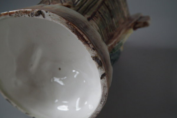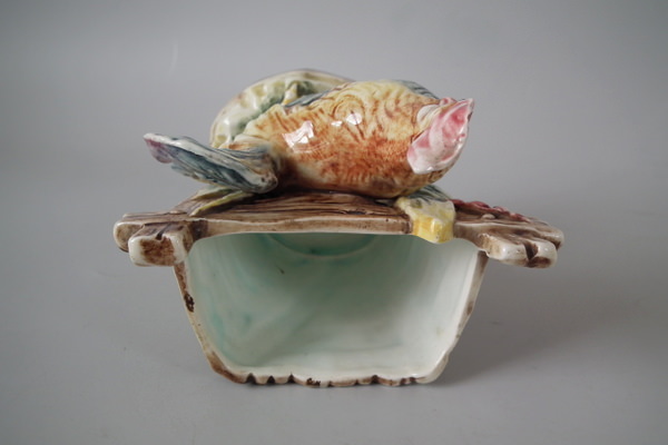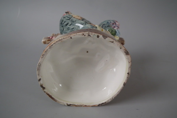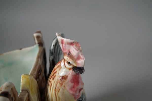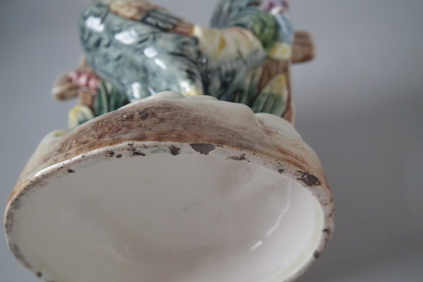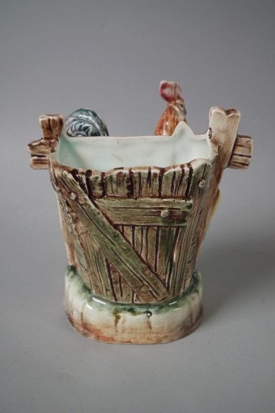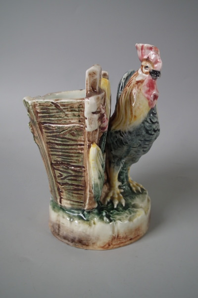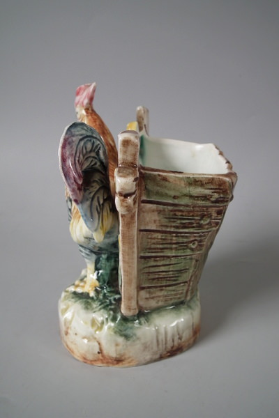 Victorian, circa 1900. 5.3ins high, 4.5ins wide, 3.5ins depth. Unidentified French Majolica posy holder which features a rooster stood in front of a fence.