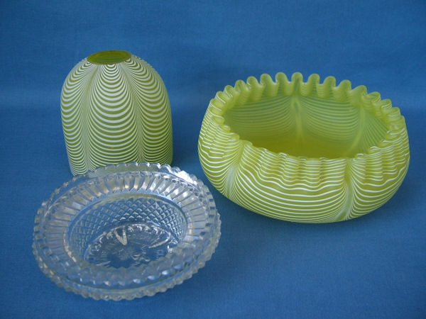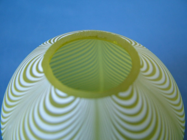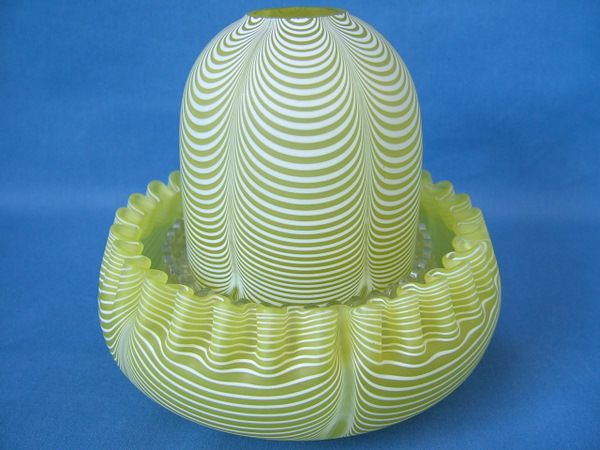 Glass fairy lamp with Nailsea-type fairy size dome in citron with white loopings. Sits in an embossed clear glass cup.