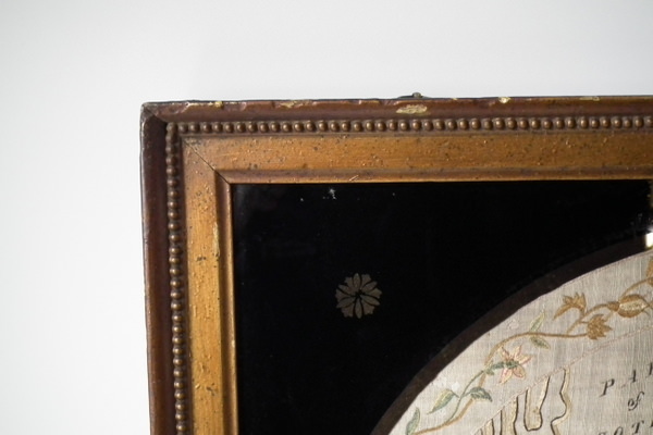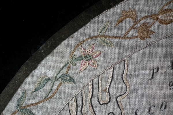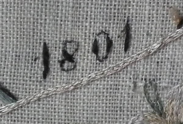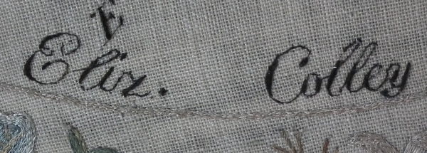 The sampler is worked in fine silk on linen ground, in a variety of stitches.
