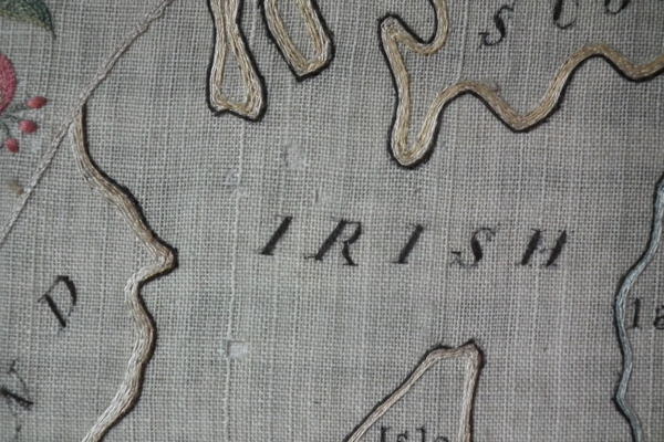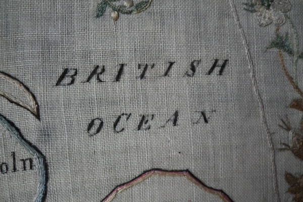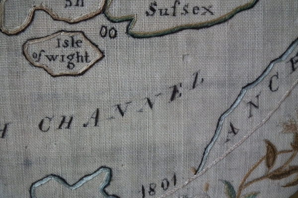 George III, dated 1801. 20ins by 16ins wide. 1801 Map Sampler by Elizabeth Colley.