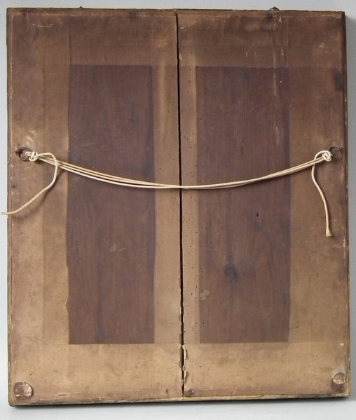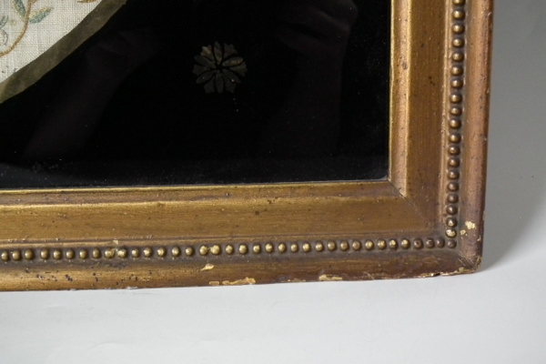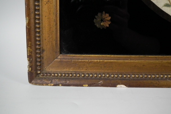 Framed in an old, possibly original, wood frame with painted black and gilt surround and rippled old glass.