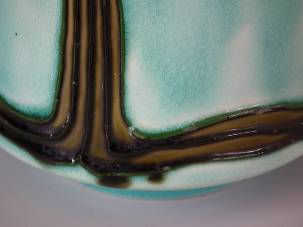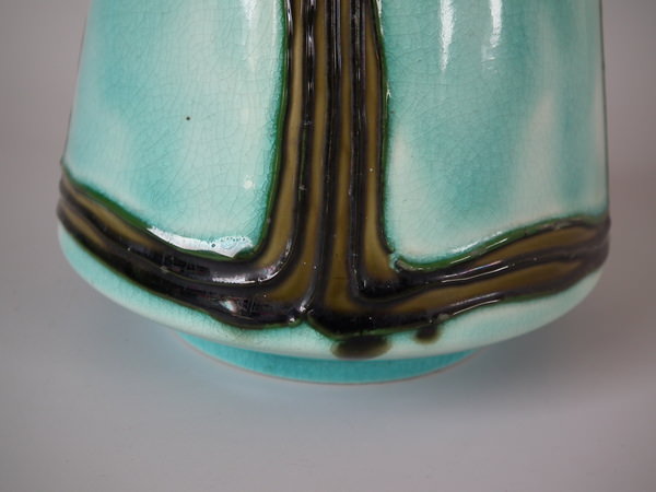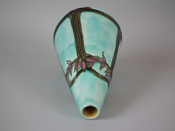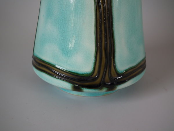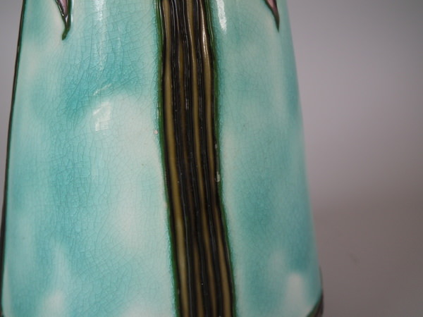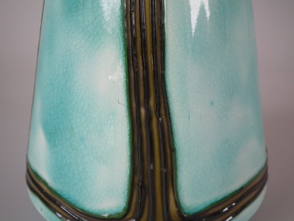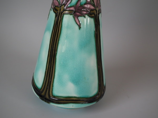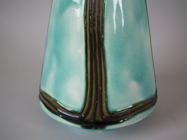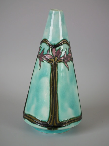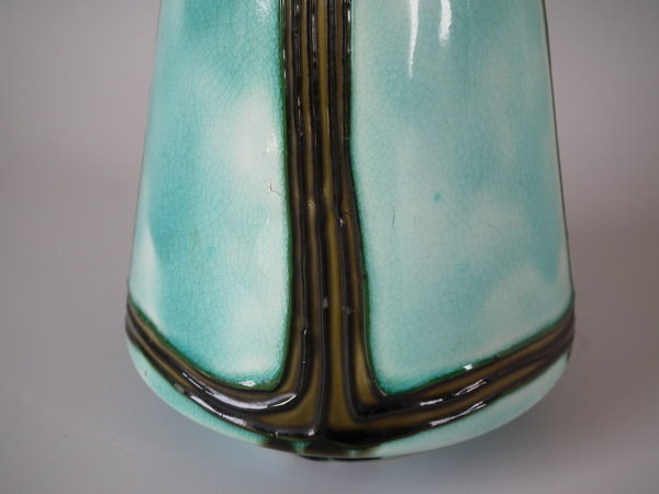 Circa 1910. 4.5ins diameter, stands 9ins high. Minton Secessionist turquoise vase of conical form.