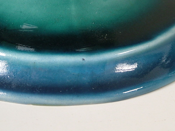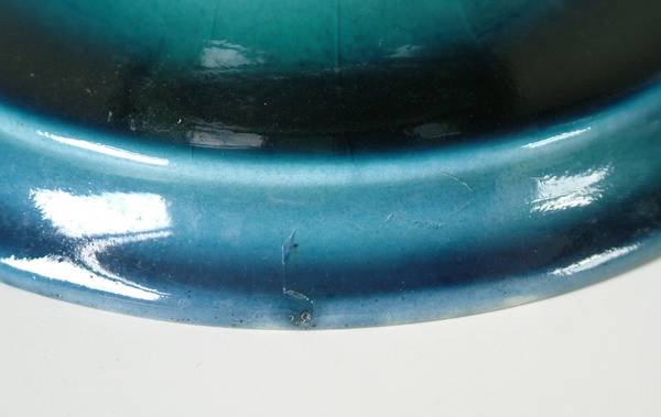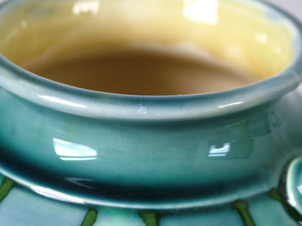 Mottled blue ground decorated with vertical strips made up of green tube lining with light green glaze inside.