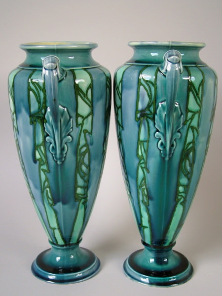 Circa 1910. 10.25ins high. Pair Minton Secessionist No. 26 two handled vases, urn shaped on circular foot.