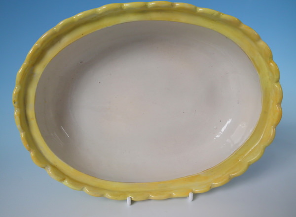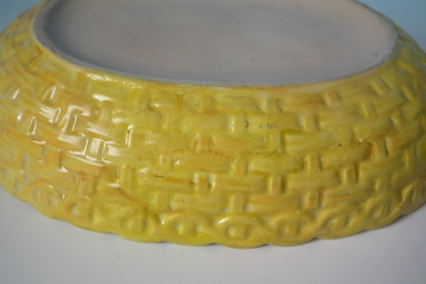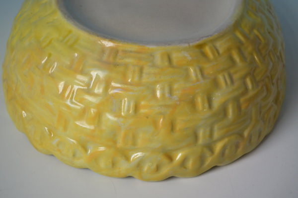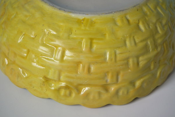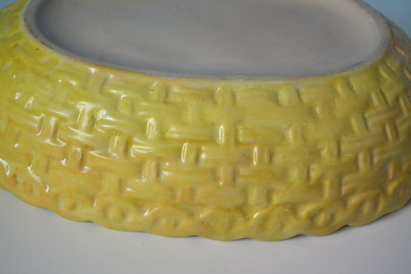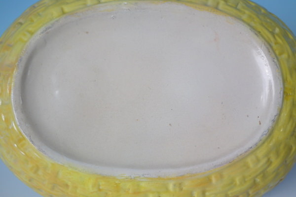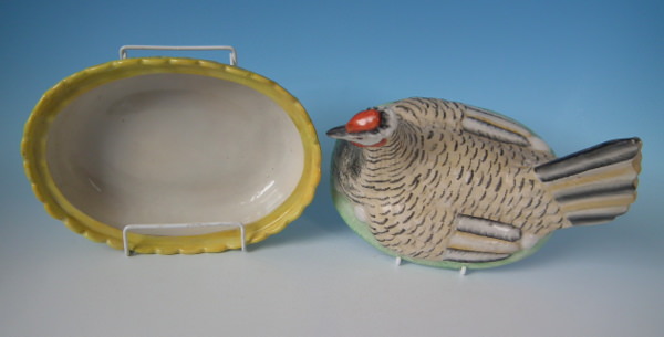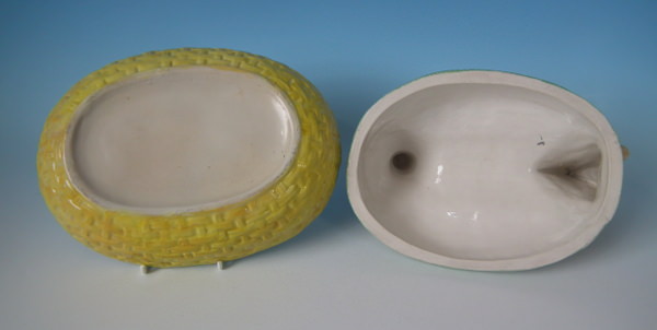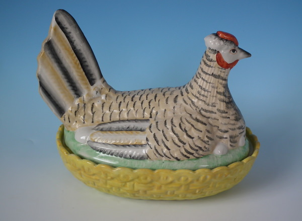 Early 20thC. 7.5ins high, 6.9ins wide, 10.2ins depth. Staffordshire egg tureen and cover which features a hen with her eggs, resting on a basketweave oval base.