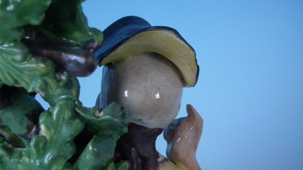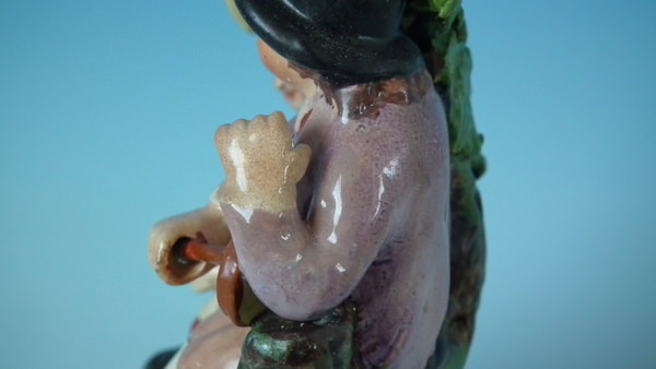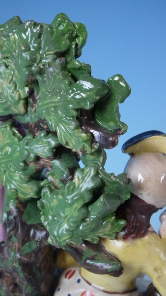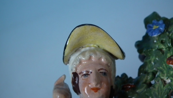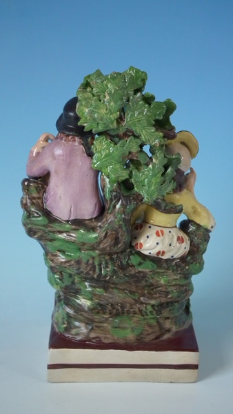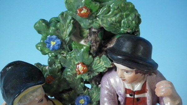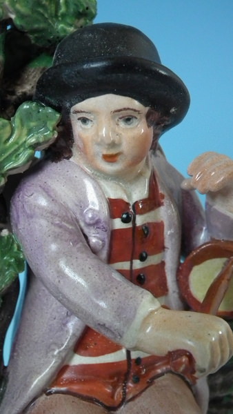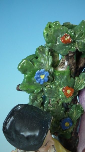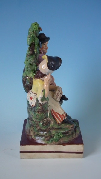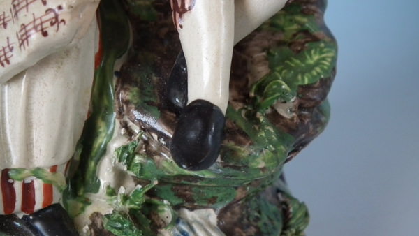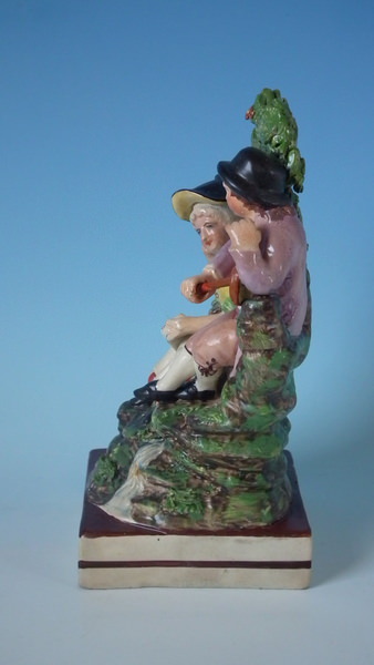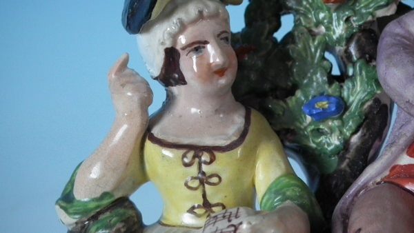 pre-Victorian, circa 1820. 7.7ins high, 4.7ins wide, 3.7ins depth. Staffordshire pearlware bocage figure with a musical theme which features a couple