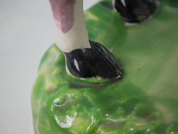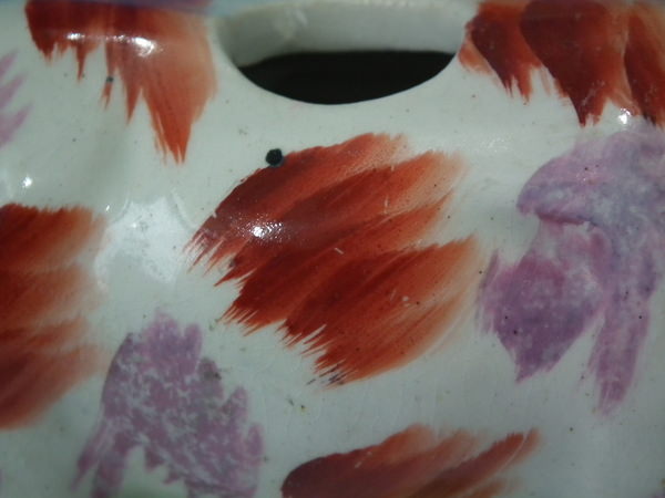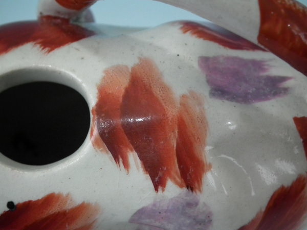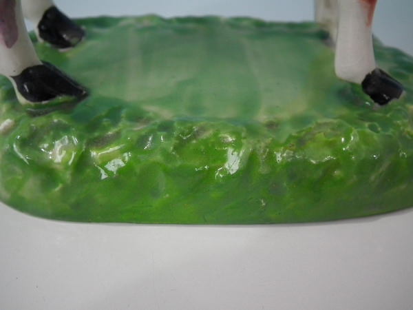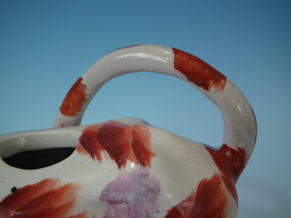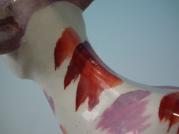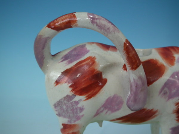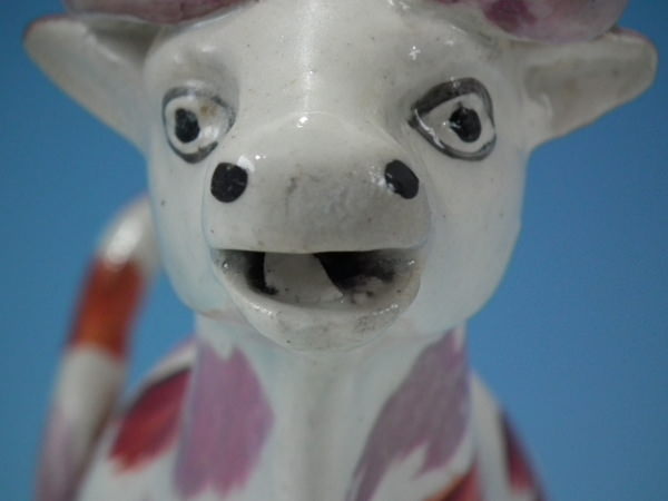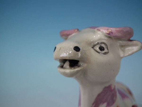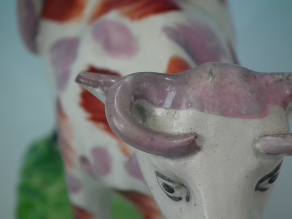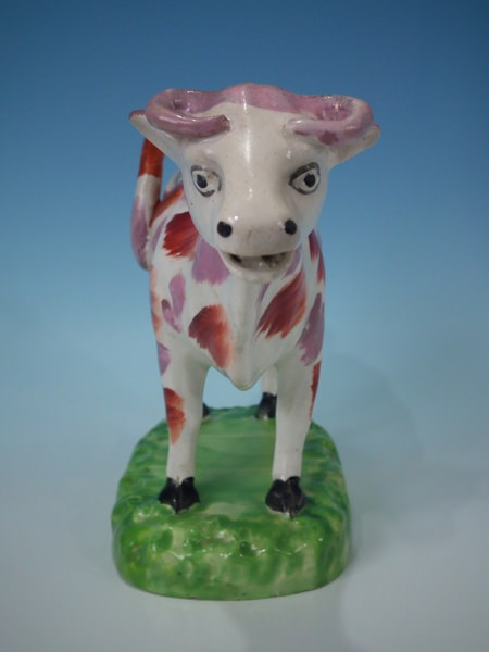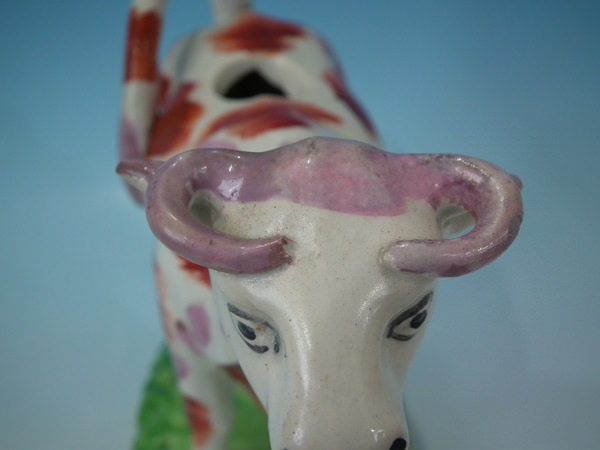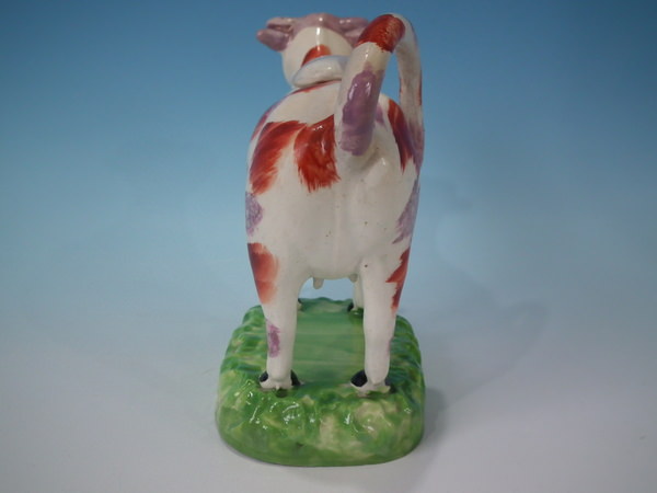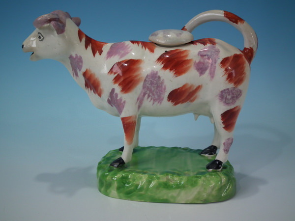 pre-Victorian, circa 1830. 5.3ins high, 7.1ins wide, 3ins depth. Staffordshire pearlware cow creamer which features a cow, stood on a rectangular base. Pink lustre version. Decorated 'in the round' - decoration to front and reverse. Hole with cover to cow's back. Mouth forms a pouring hole.