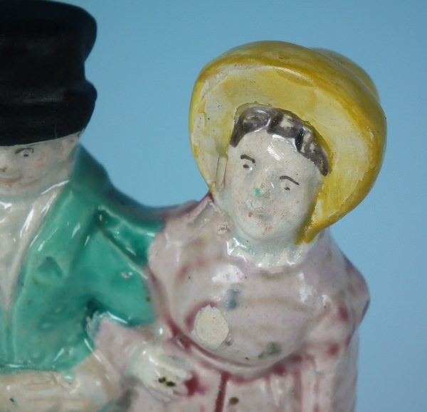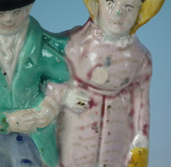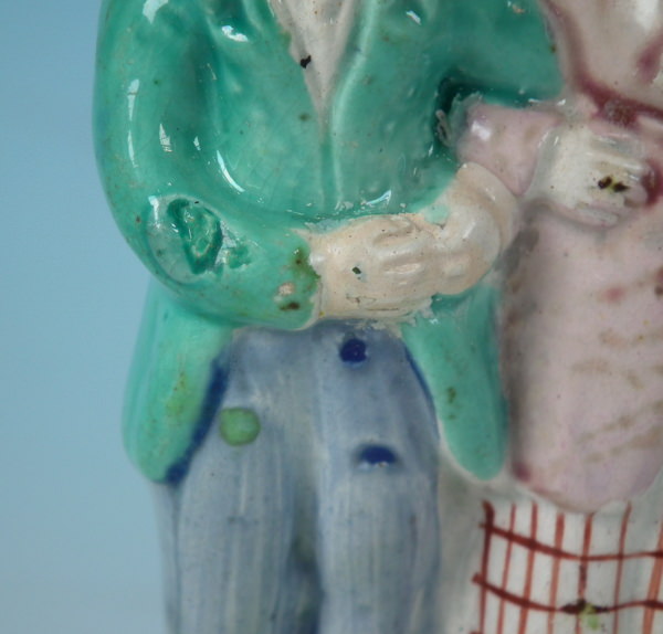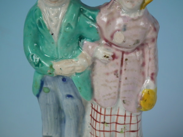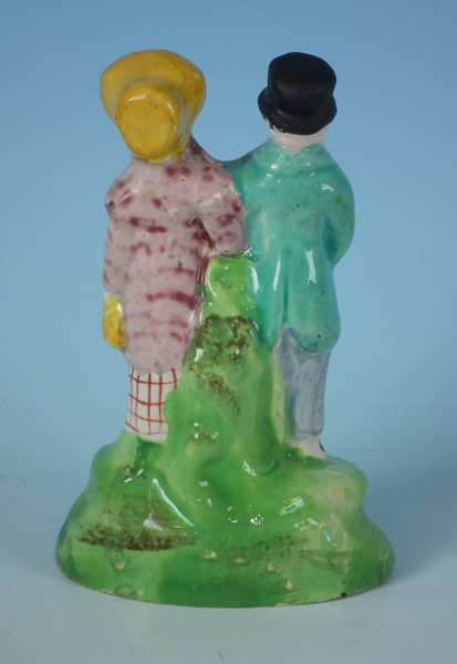 pre-Victorian, circa 1820. 3.7ins high, 2.6ins wide, 1.8ins depth. Staffordshire pearlware figure which features 'The Dandies', stood on a shaped hollow base.