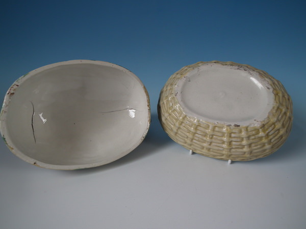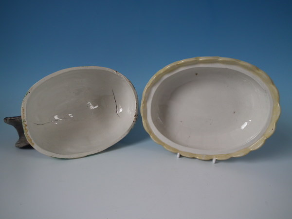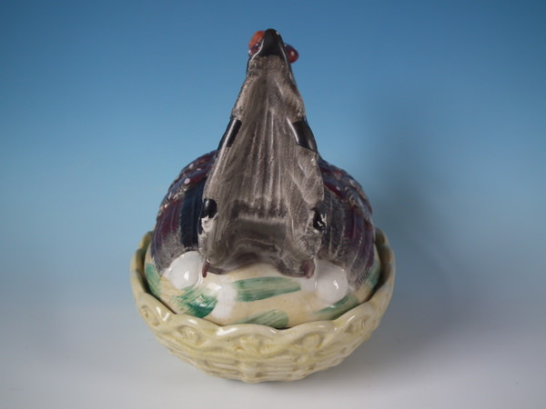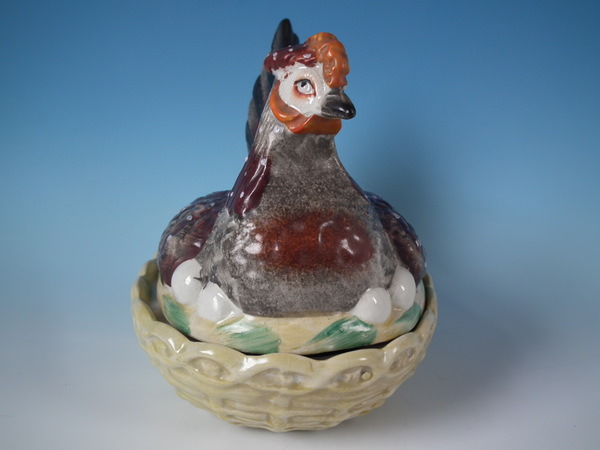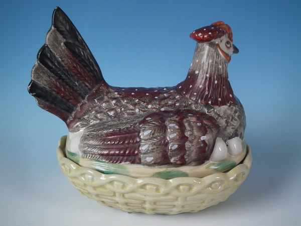 Victorian, circa 1860. 7.1ins high, 8.3ins wide, 6.3ins depth. Staffordshire egg tureen and cover which features a hen, resting on an oval base. Multi-coloured version.