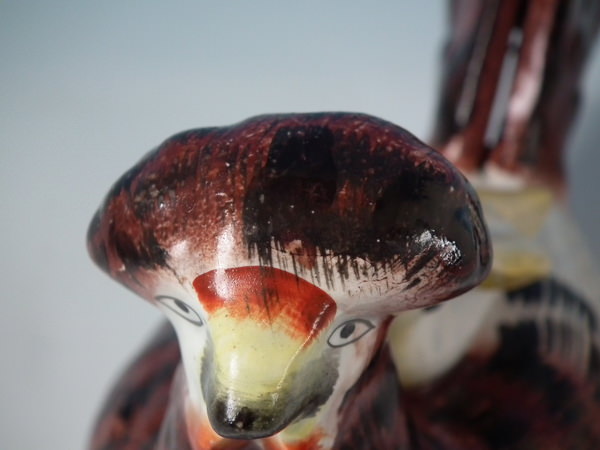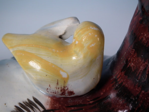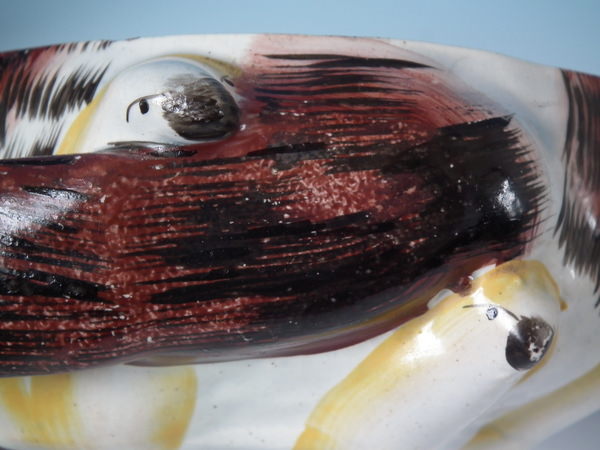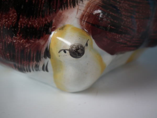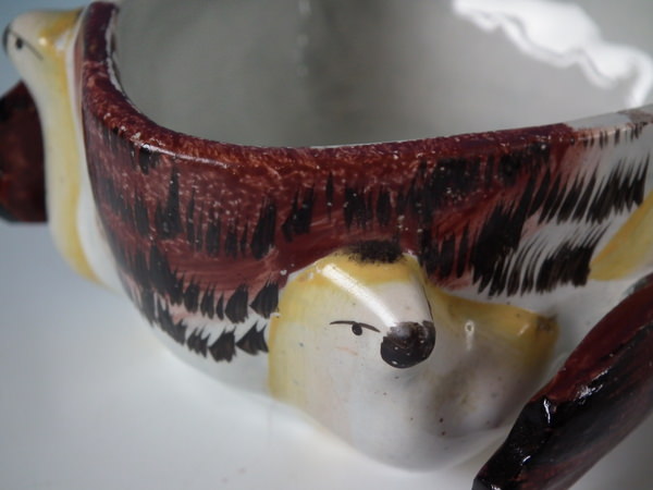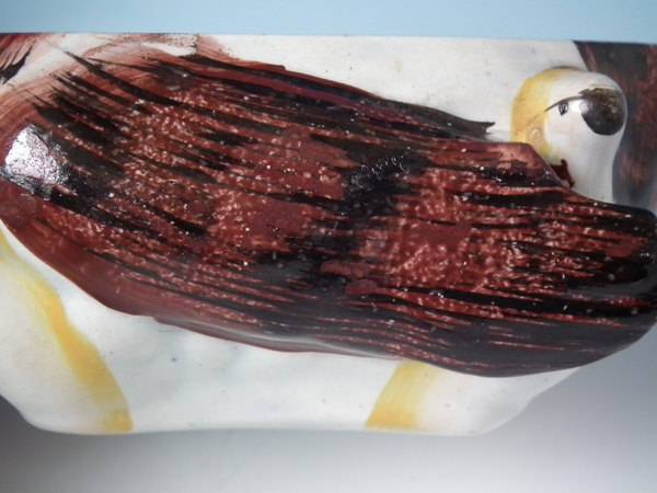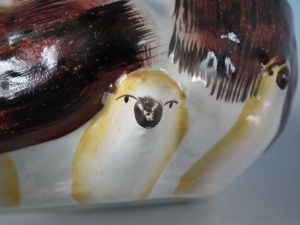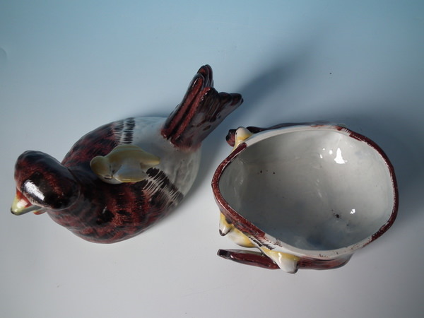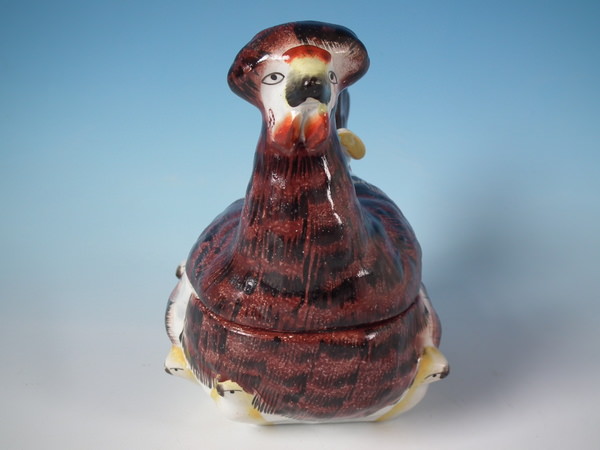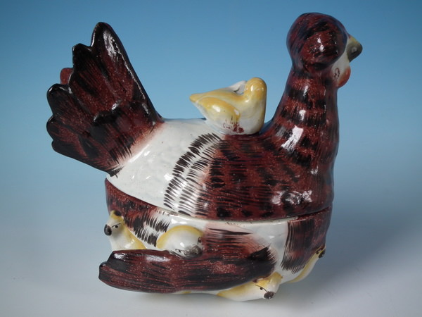 Victorian, circa 1860. 5.9ins high, 6.3ins wide, 4.3ins depth. Staffordshire tureen with cover with a pastoral theme which features a hen with her seven chicks. One of the chicks is perched on her back, the others peep out from underneath. Multi-coloured version.