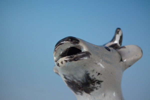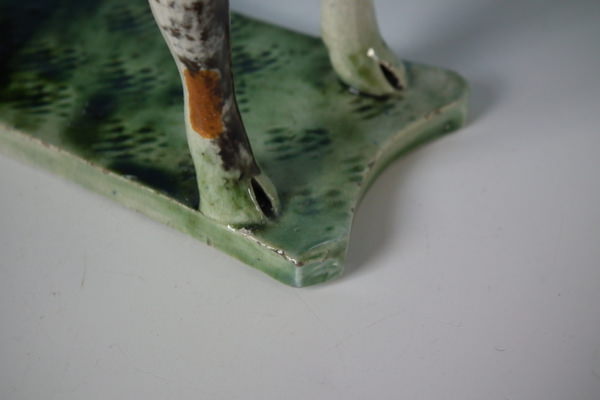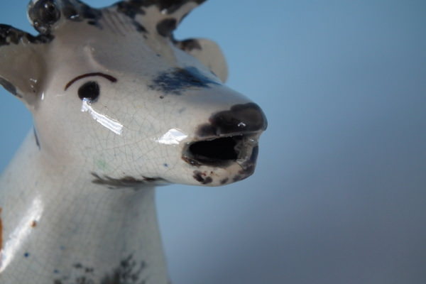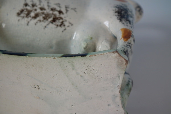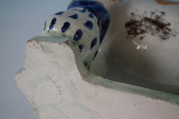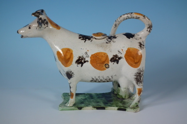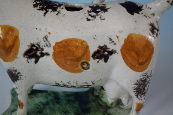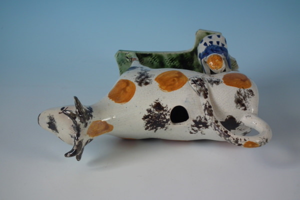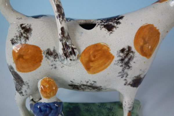 pre-Victorian, circa 1800. 4.9ins high, 2.8ins wide, 6.7ins depth. Staffordshire cow creamer which features a cow with milk maid, seated on a shaped base.