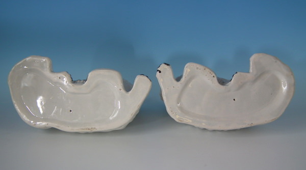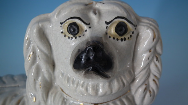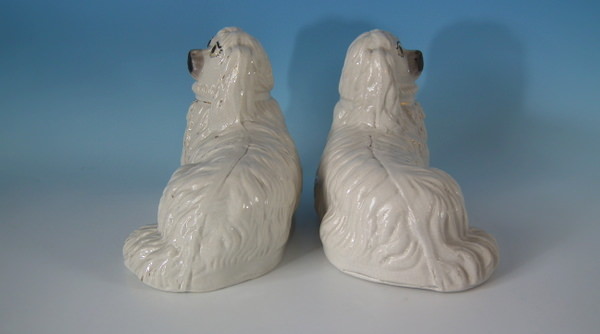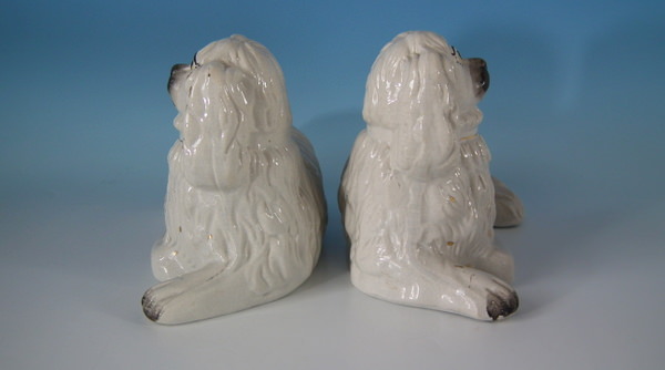 Victorian, circa 1880. Tallest is 5.9ins high, 9.4ins wide, 4.9ins depth. Pair of Staffordshire figures which feature a spaniel, recumbent directly on the ground, no base.