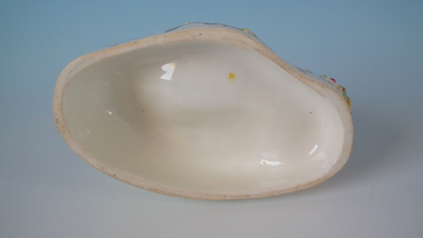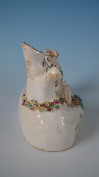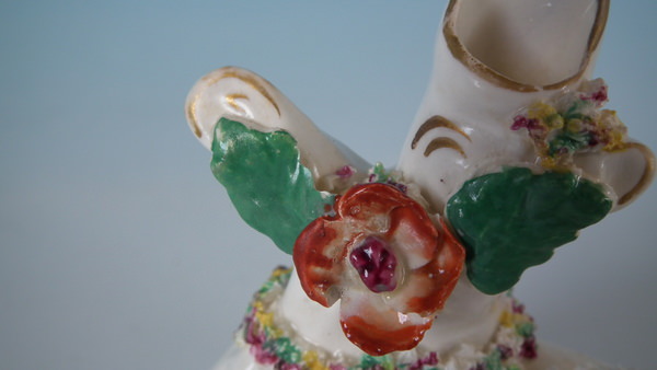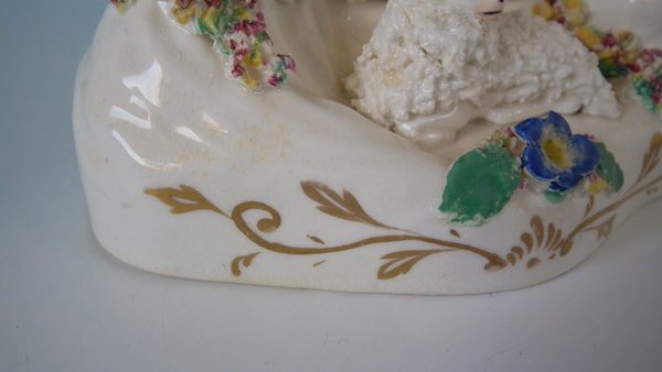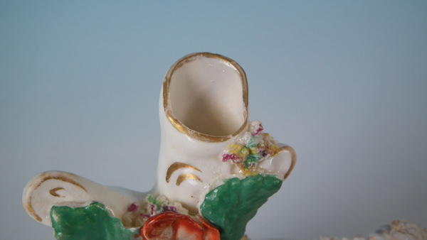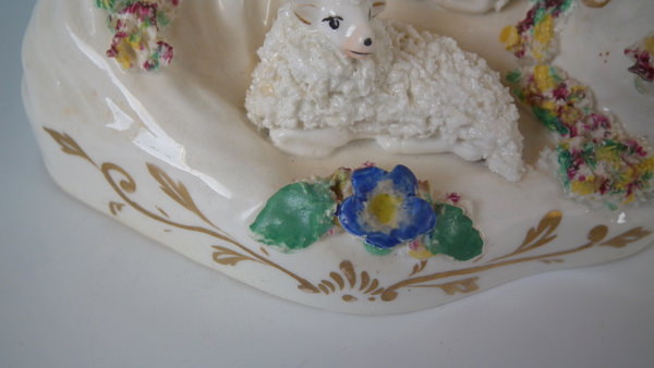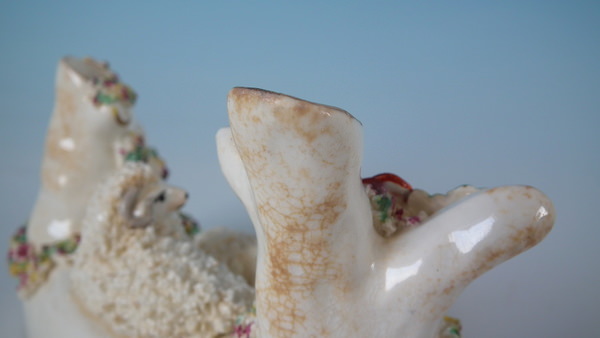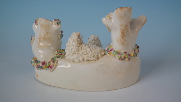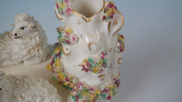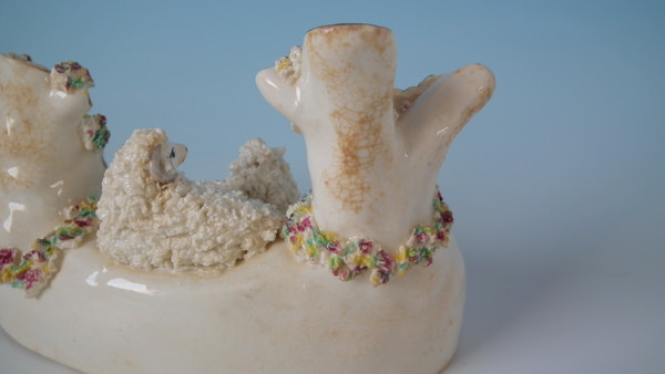 Victorian, circa 1860. 3.5ins high, 5.1ins wide, 3ins depth. Staffordshire spill vase with a pastoral theme which features a ram and ewe, recumbent on a shaped hollow base.