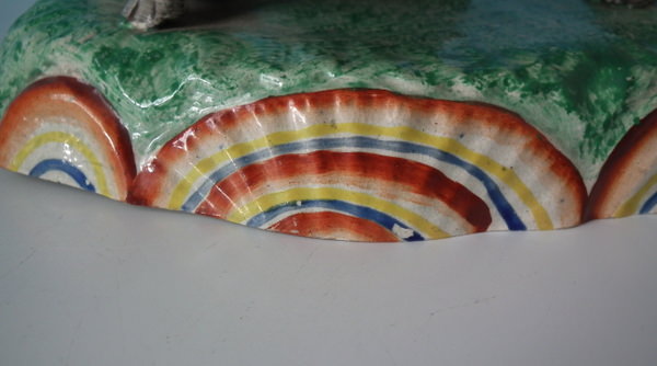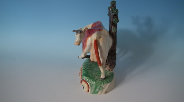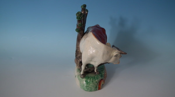 Obadiah Sherratt Staffordshire pearlware figure with a pastoral theme which features a cow being bitten by a snake, stood on an oval rainbow base.