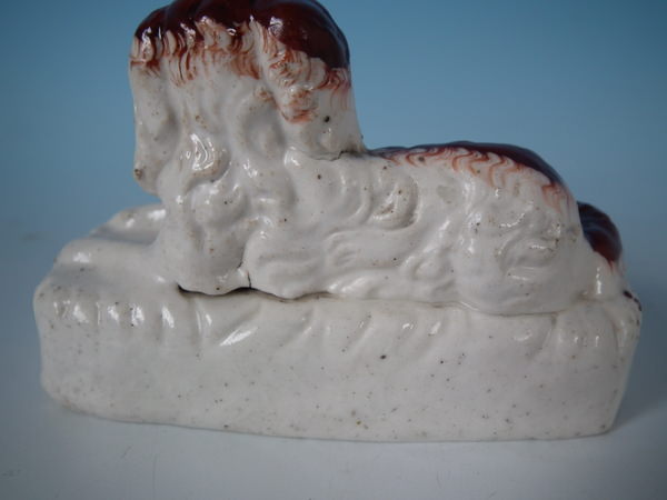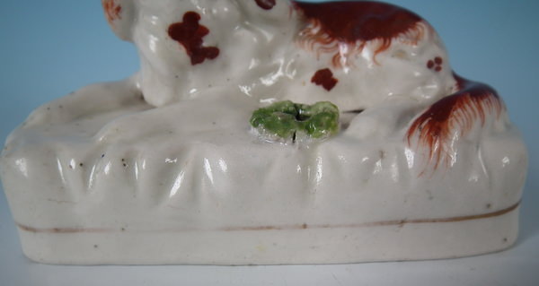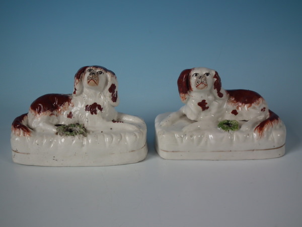 Victorian, circa 1860. Tallest is 3.1ins high, 4.5ins wide, 2.2ins depth. Pair of Staffordshire inkwells which feature a spaniel, recumbent on a rectangular base. Russet and white version. Dull gilt base line and embellishment.