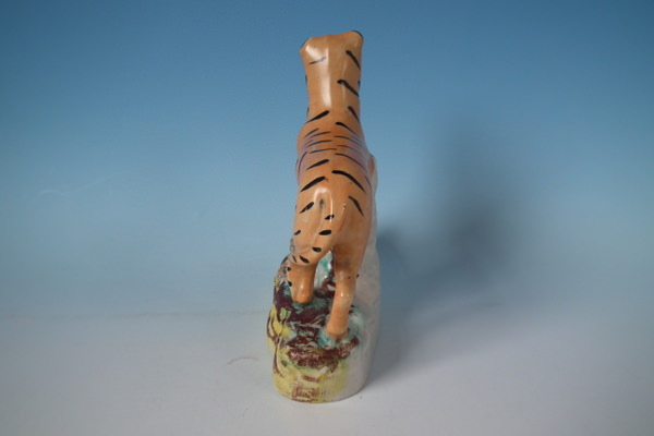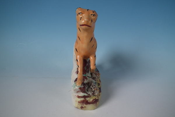 Staffordshire figure which features a tiger, stood on a shaped base. Decorated mainly to the front. Vent hole to the underside.