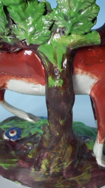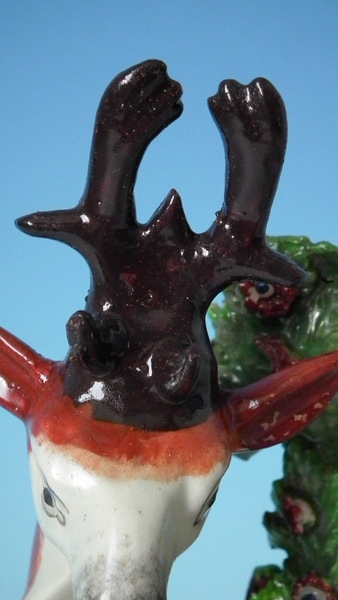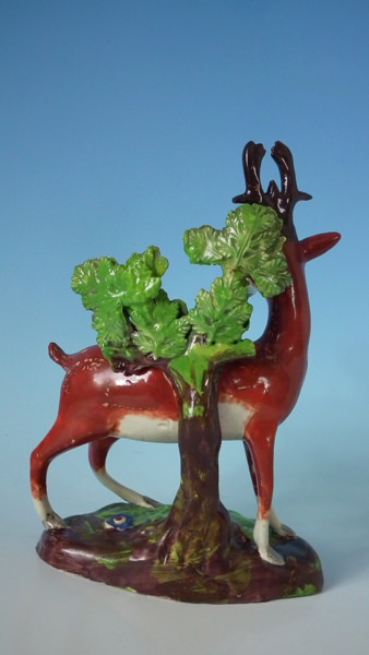pre-Victorian, circa 1820. 8.3ins high, 6.7ins wide, 3.5ins depth. Staffordshire pearlware bocage figure which features a stag, stood on a shaped base. Multi-coloured version.