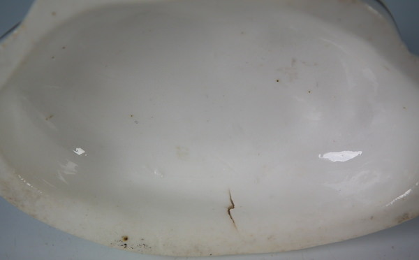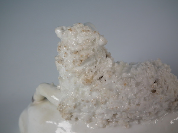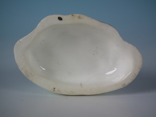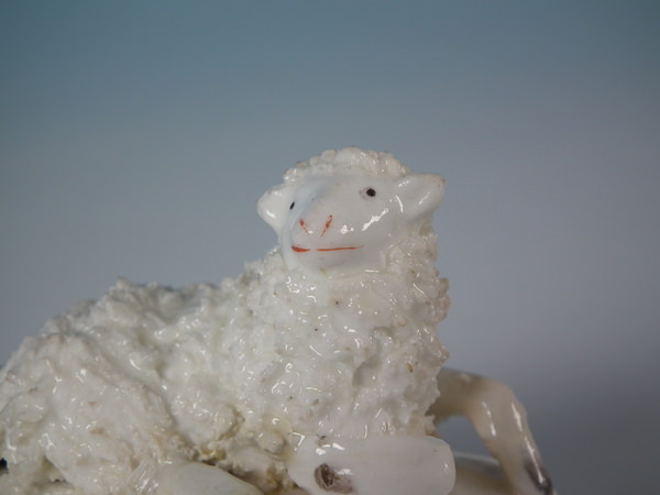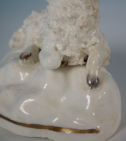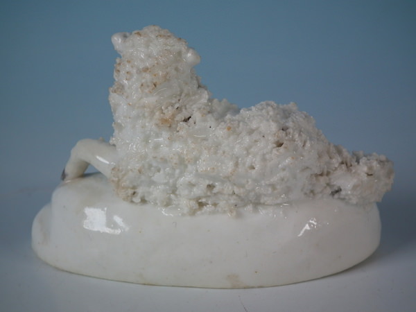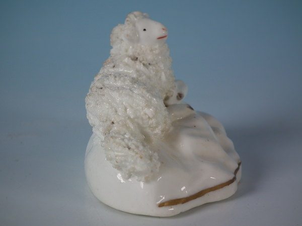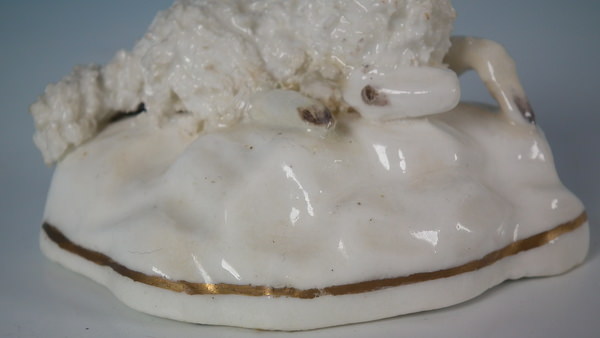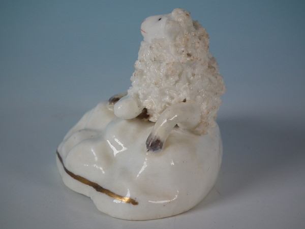 Victorian, circa 1860. 2ins high, 3ins wide, 1.8ins depth. Staffordshire porcellaneous figure which features a sheep, recumbent on a shaped base. White and gilt version. Dull gilt base line.