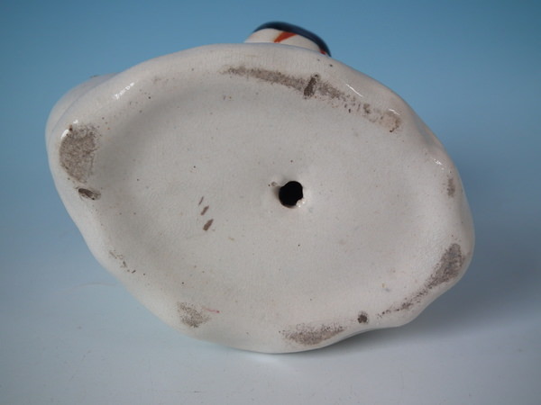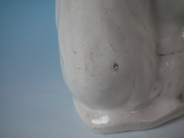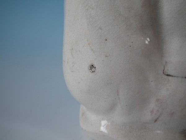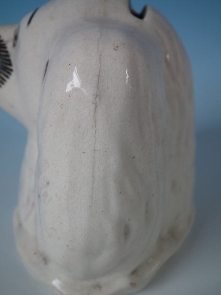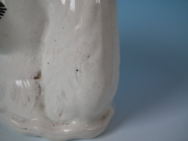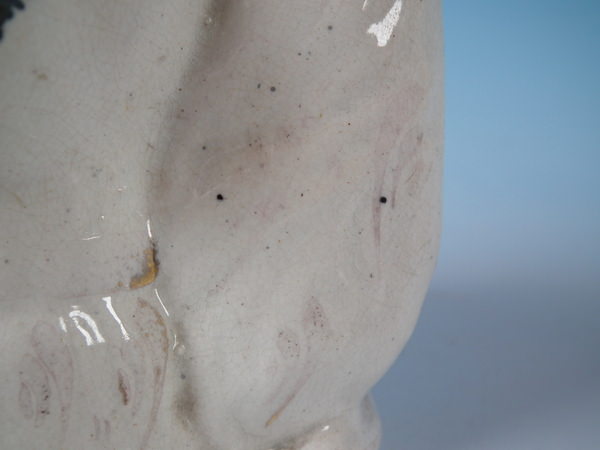 KILN EFFECTS: flecks of stray coloured glaze to left ear and top of head;