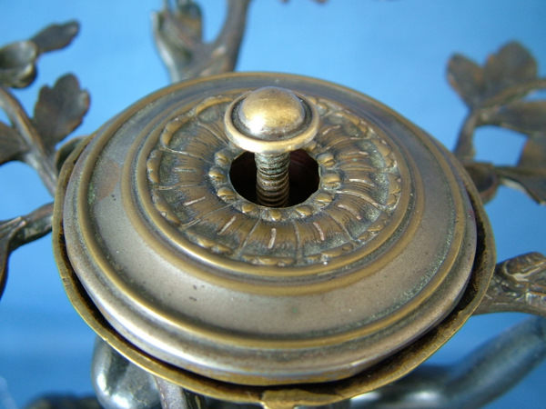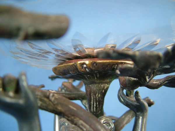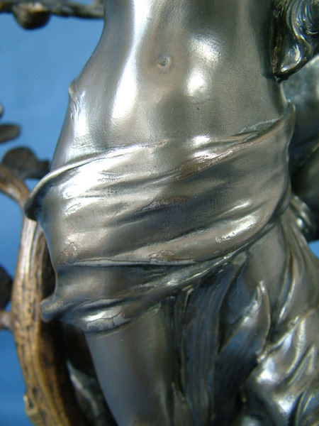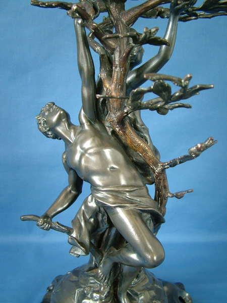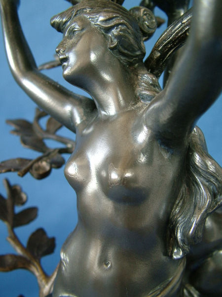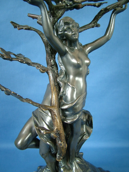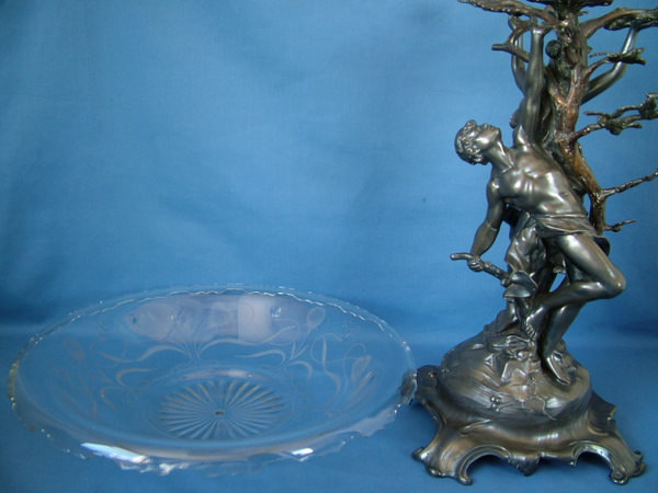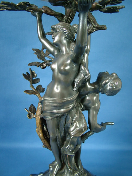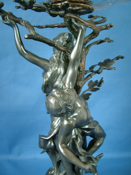 WMF Figural centrepiece with maiden, boy and glass bowl. Features a naked boy and girl, entwined in a sheet. A tree winds around them.