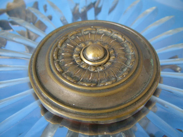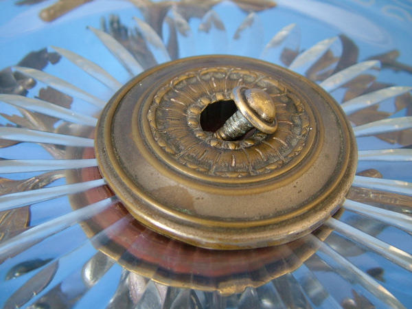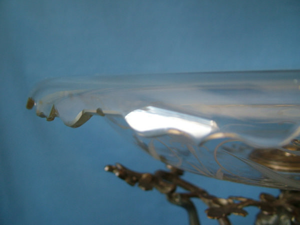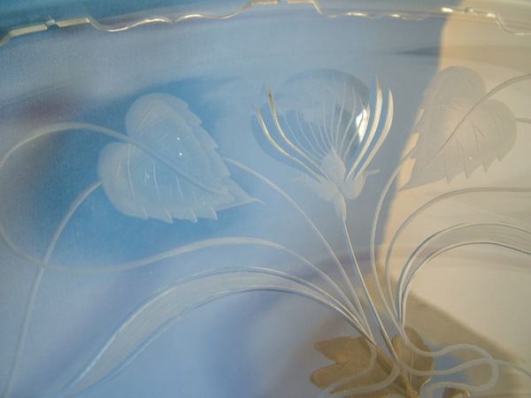 The glass bowl has flowers and leaves etched around the sides, in the art nouveau style.