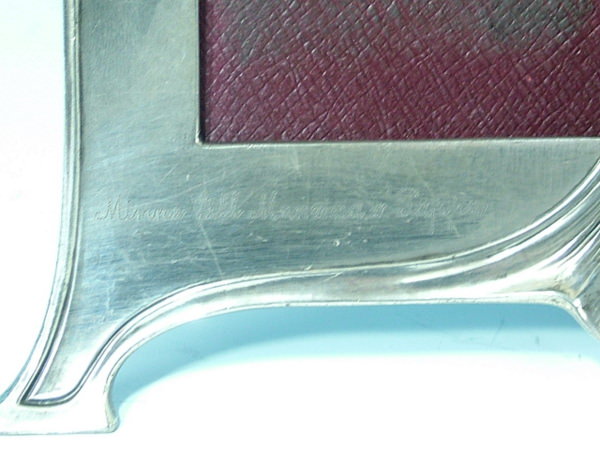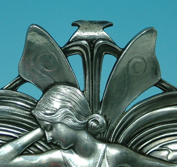 Circa 1910. 7.25ins high. WMF double photo frame with central maiden, dressed in a flowing robe.