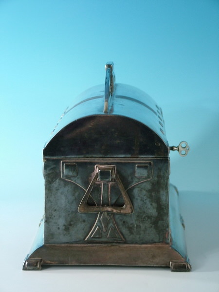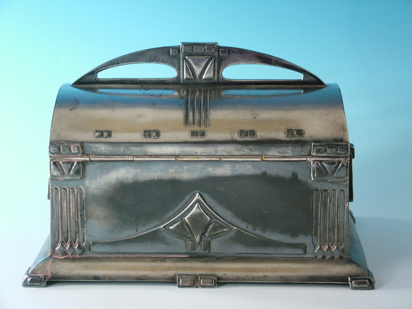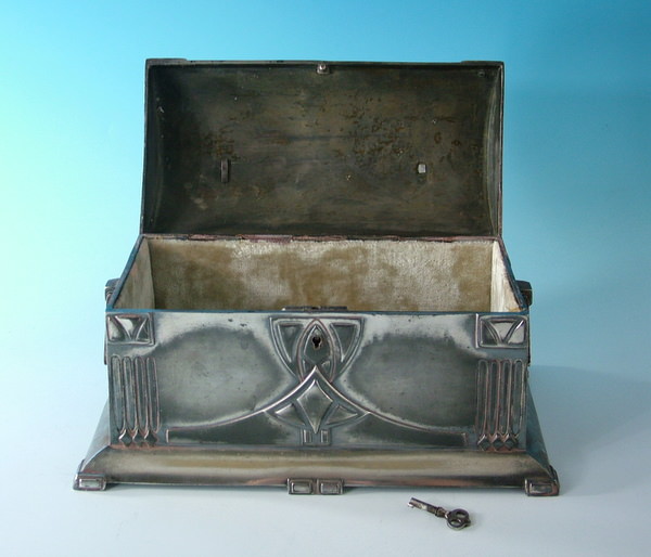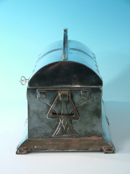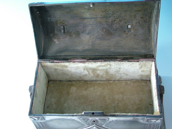 Circa 1910. 9.5ins by 5.5ins, 6.25ins high. WMF silver plated jewel casket, with lining, hinged lid, and working lock and key. Handle to either side. Six feet to base.