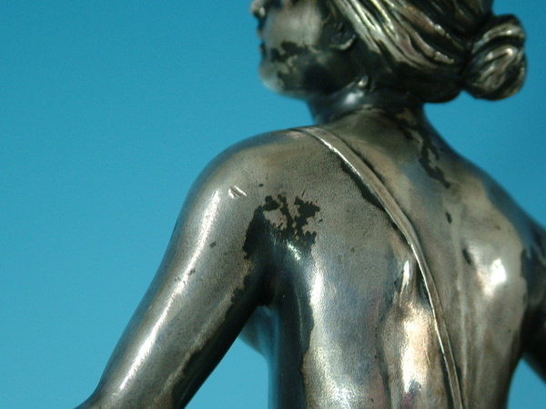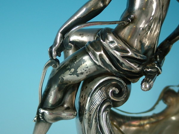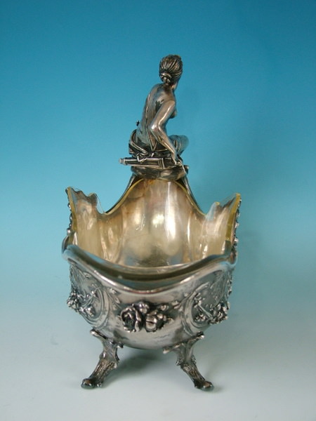 Circa 1910. 16ins by 7ins, 11ins high. WMF silver plated oval flower dish with a scantily clad maiden, probably the hunting goddess Diana, seated on one end.