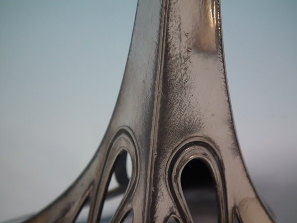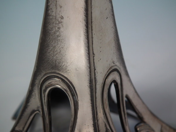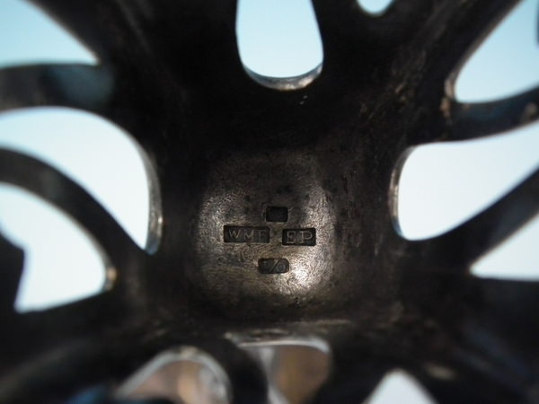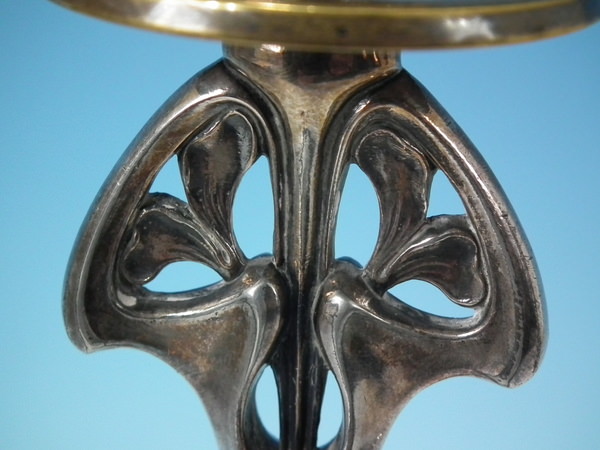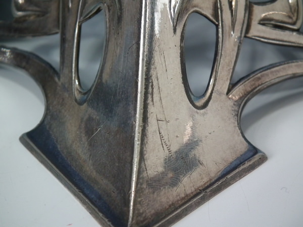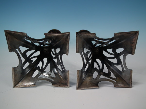 Circa 1910. 11ins high. Pair WMF Art Nouveau candlesticks. Four footed square bases, pierced tapered stands, sconces on top with brass liners.
