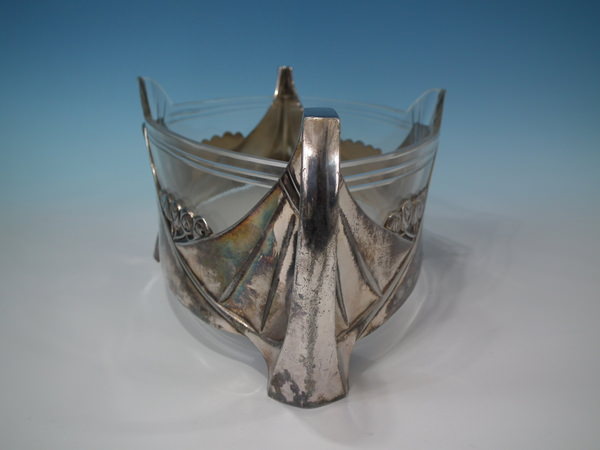 Circa 1910. 14.5ins wide. WMF flower dish with glass liner. The dish is decorated with stylised roses. Two ornate handles and four feet. The glass liner has a shaped rim. This flower dish is part No. 245. Flower Set.