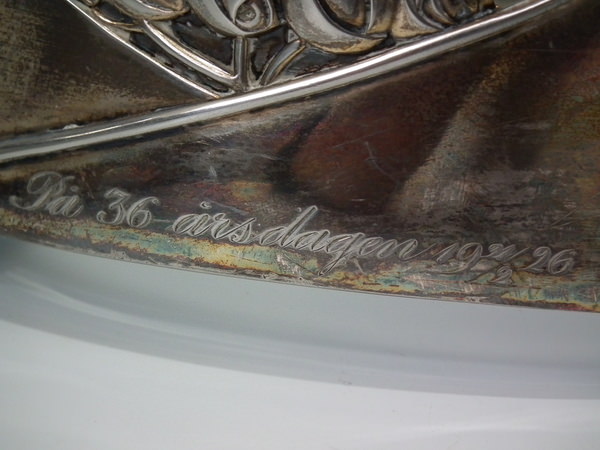 The piece has had text inscribed on one side 'PÅ 36- ÅRSDAGEN 19 21/2 26' 'FrÅn Astrid' Which translates to 'ON 36 Anniversary 21st of February 1926' ' From Astrid'.